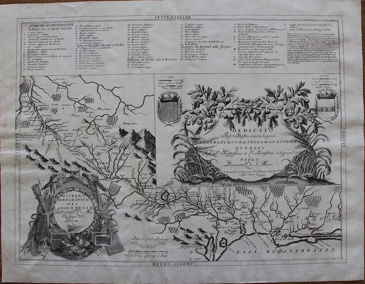 Interessante mappa rappresentante il Canal du Midi, un canale artificiale francese lungo circa 250 chilometri che collega il fiume Garonna al mar Mediterraneo.