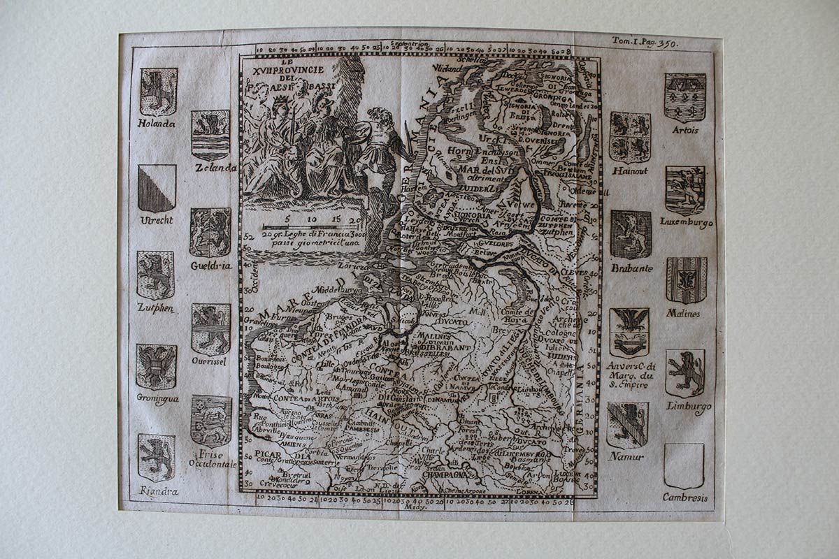 Mappa di 17 province dei Paesi Bassi con i loro stemmi raffigurati a destra e a sinistra.