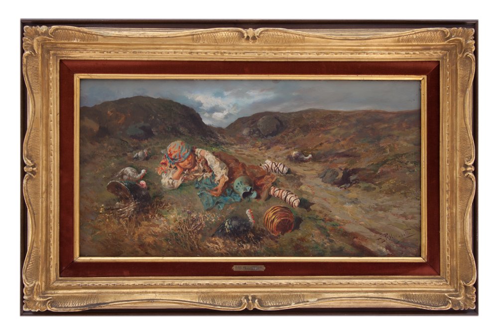 Tito Pellicciotti Barisciano (AQ) 1871 – 1950 Giovane guardiana dei tacchini Olio su tavola cm 31x59,5
