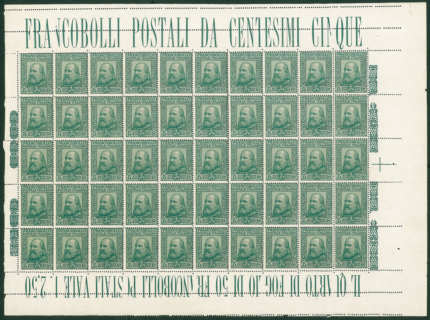 REGNO D'ITALIA - 1910 - 5 cent Garibaldi - foglio completo di 50 - gomma...