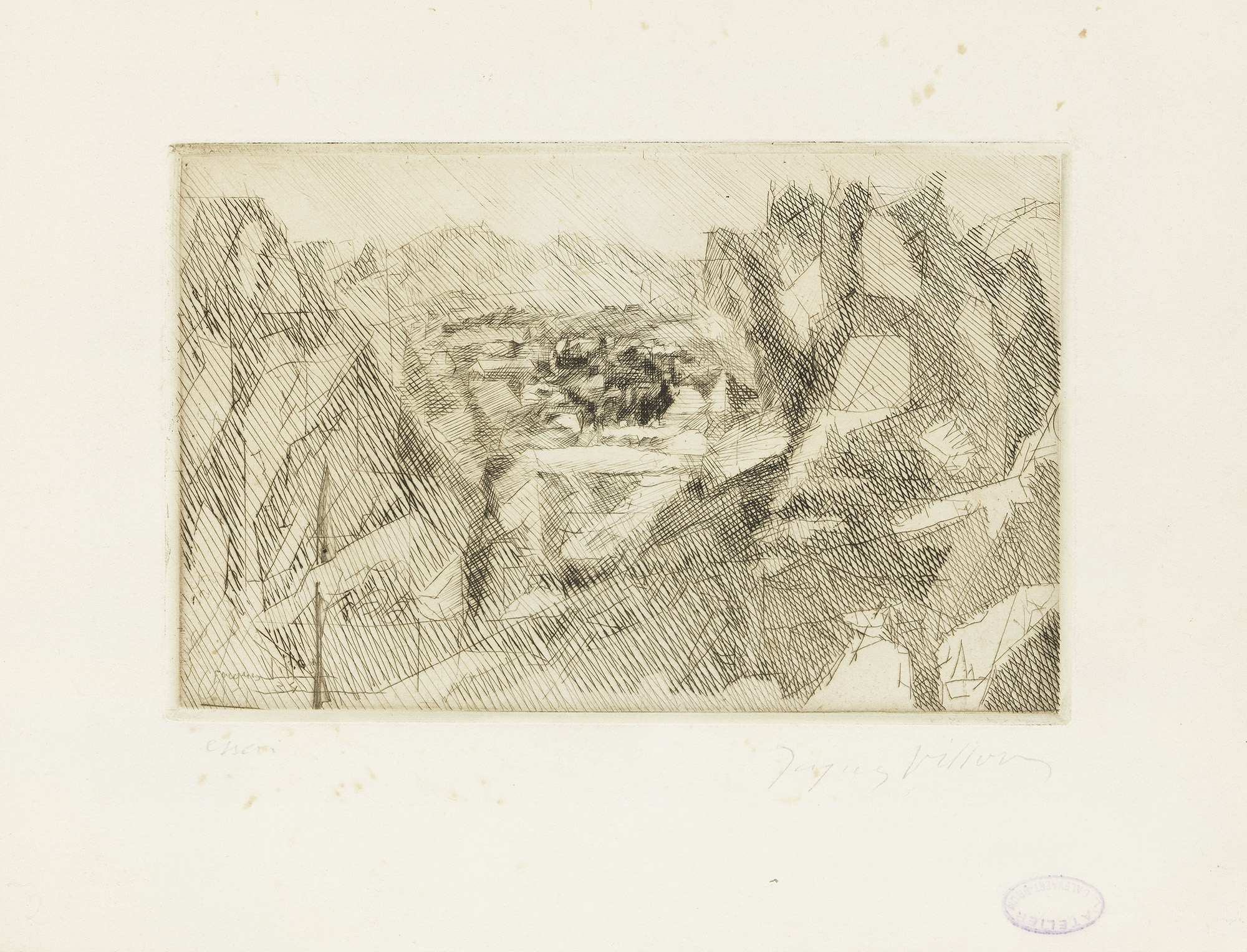 Firma e data in lastra: Jacques Villon / 34, firma a matita sul margine in basso a destra: Jacques Villon, tiratura in basso a sinistra: essai, timbro in basso a destra: Atelier / L. Calevaert-Brum.