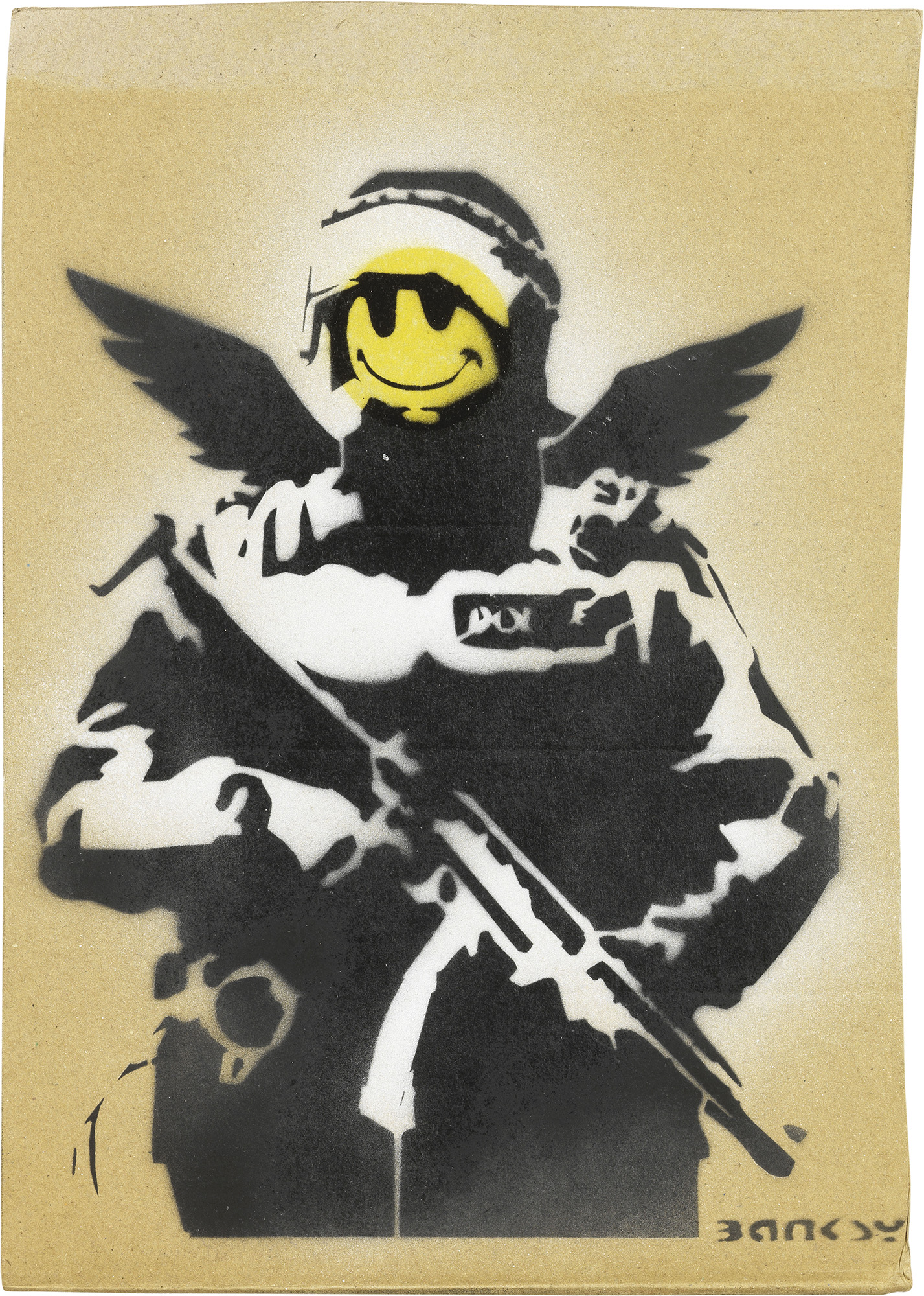 Firma a stencil in basso a destra: Banksy; scritta e tiratura al verso: Enjoy / your / free / art / Banksy is Dismal / 50/50: timbro Dismaland Bemusement Park.