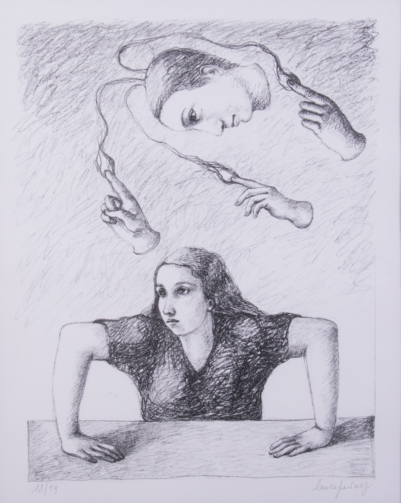 A) Paola Gandolfi, Senza titolo, litografia, es. 18/99, cm. 48x35,5. Firma a matita sul margine in basso a destra: Paola Gandolfi, tiratura in basso a sinistra: 18/99;