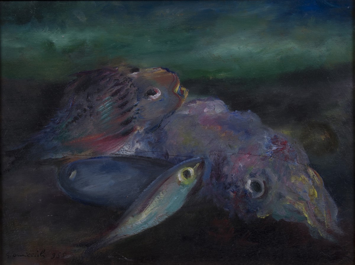 A) Pesci, 1955, olio su tavola, cm. 27,5x36. Firma e data in basso a sinistra: G. Omiccioli 955. Al verso: tre timbri Galleria Franco Cancelliere, Messina. Certificato su foto Galleria Franco Cancelliere, Messina;