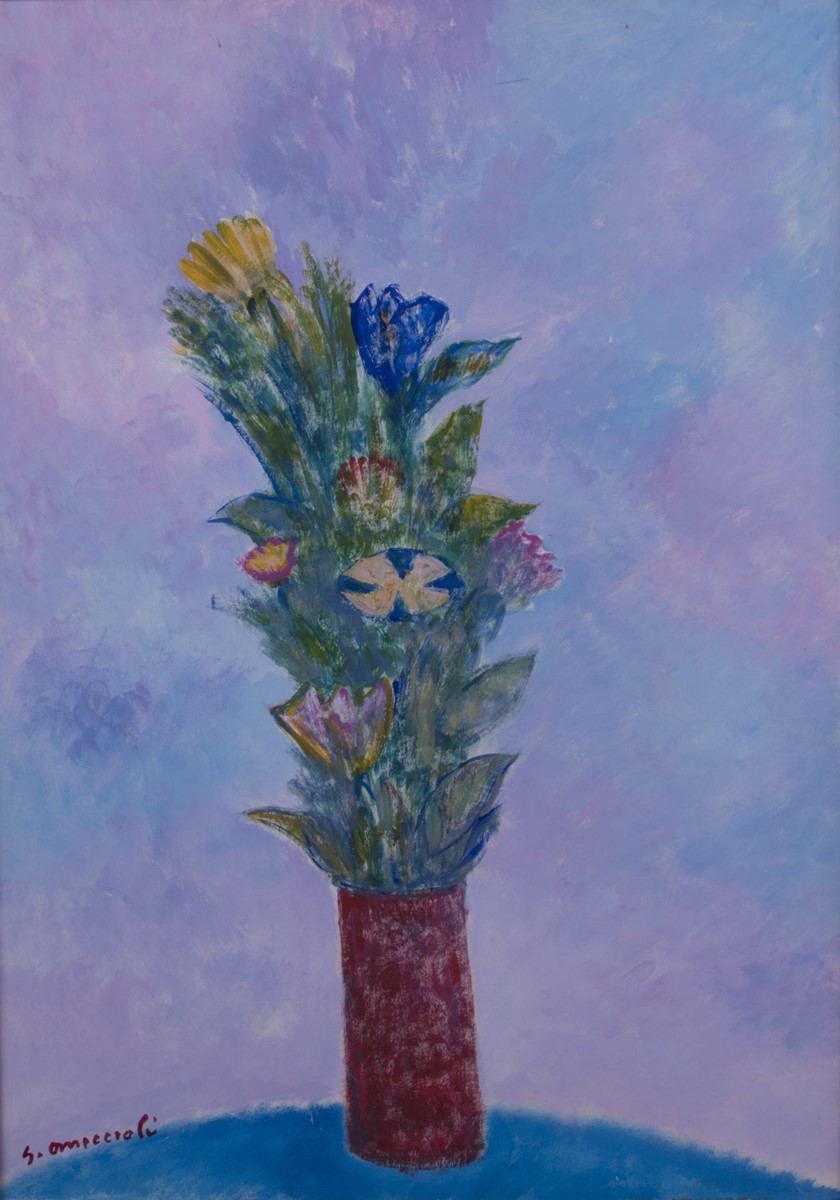 B) Fiori nel vaso rosso, 1969, olio su cartone, cm. 50,5x36. Firma in basso a sinistra: G. Omiccioli; titolo, data e dichiarazione di autenticità al verso: Fiori nel vaso rosso 1969 / dipinto e firmato di mia mano / Giovanni Omiccioli: tre timbri Galleria Franco Cancelliere, Messina: timbro Il Poliedro, Roma: etichetta con n. 0178 e due timbri Galleria d'Arte Moderna Mosaico, Messina / Siracusa. Certificato su foto Galleria Franco Cancelliere, Messina.