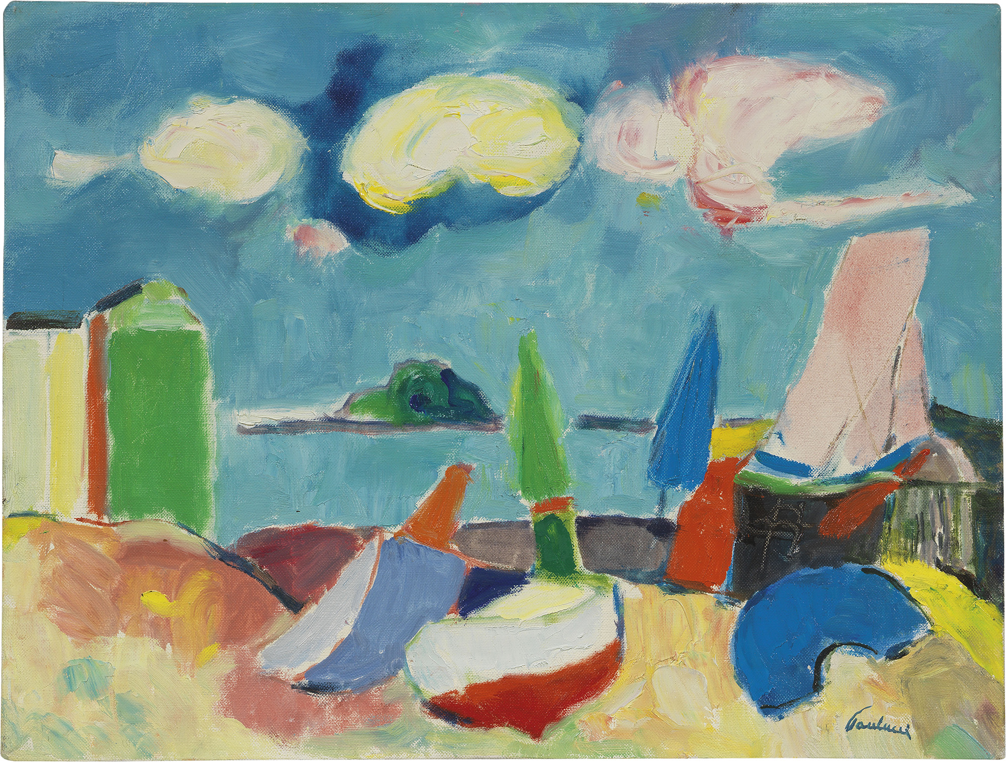 Firma in basso a destra: Paulucci; firma e titolo al verso sulla tela: Paulucci / Barche / Nuvole.