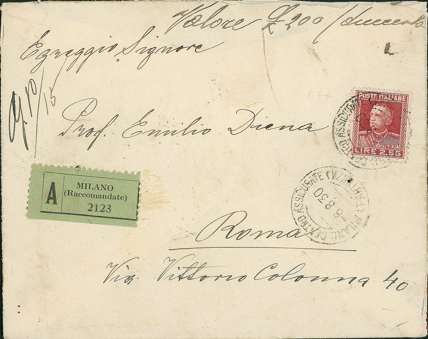 REGNO D'ITALIA - 2,55 lire isolato su assicurata da Milano a Roma del 6.8.30 (216 - 250)