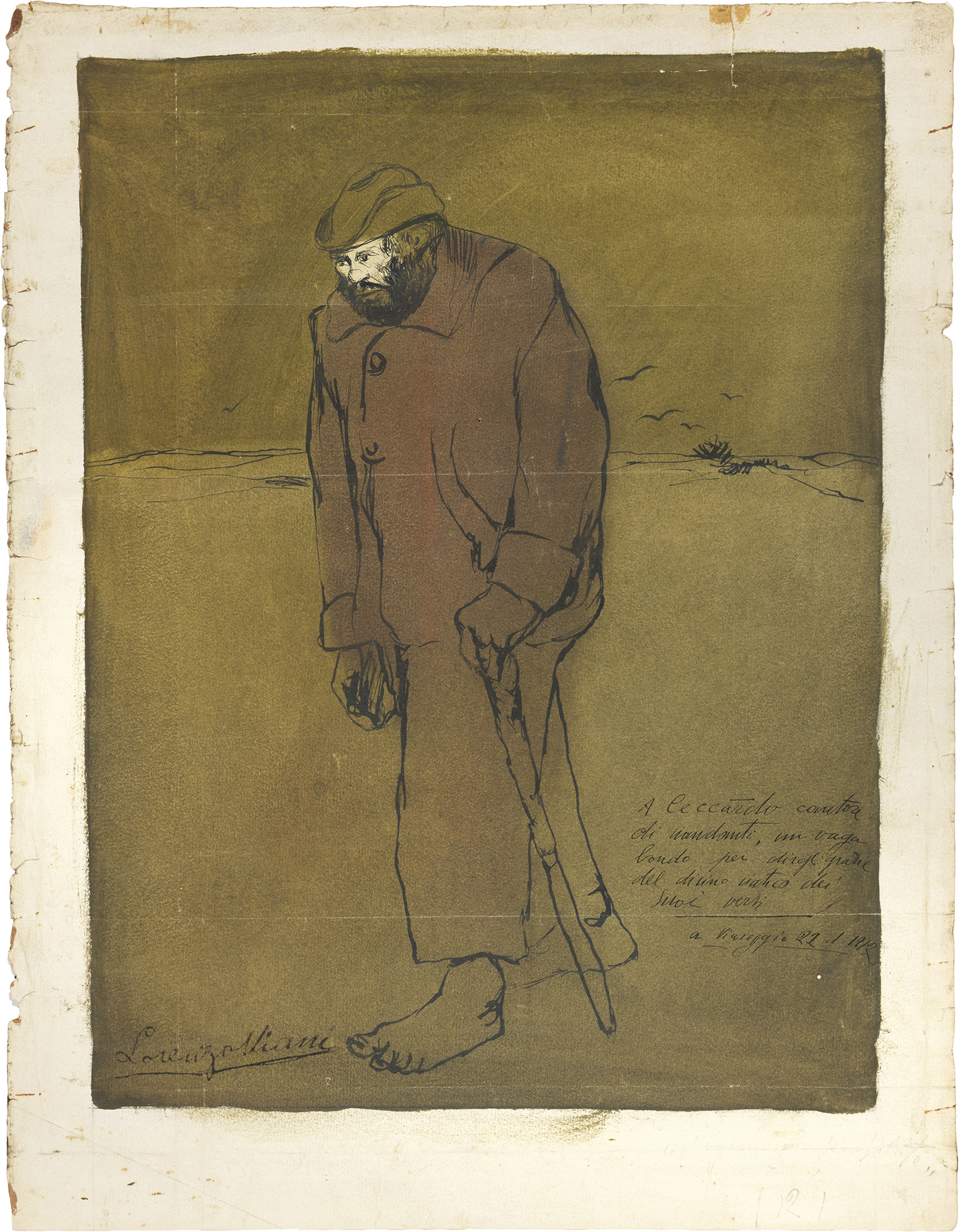 Firma in basso a sinistra: Lorenzo Viani, dedica in basso a destra: A Ceccardo cantore di viandanti, un vagabondo per dirgli grazie del divino viatico dei suoi versi / a Viareggio 22.1.1912.