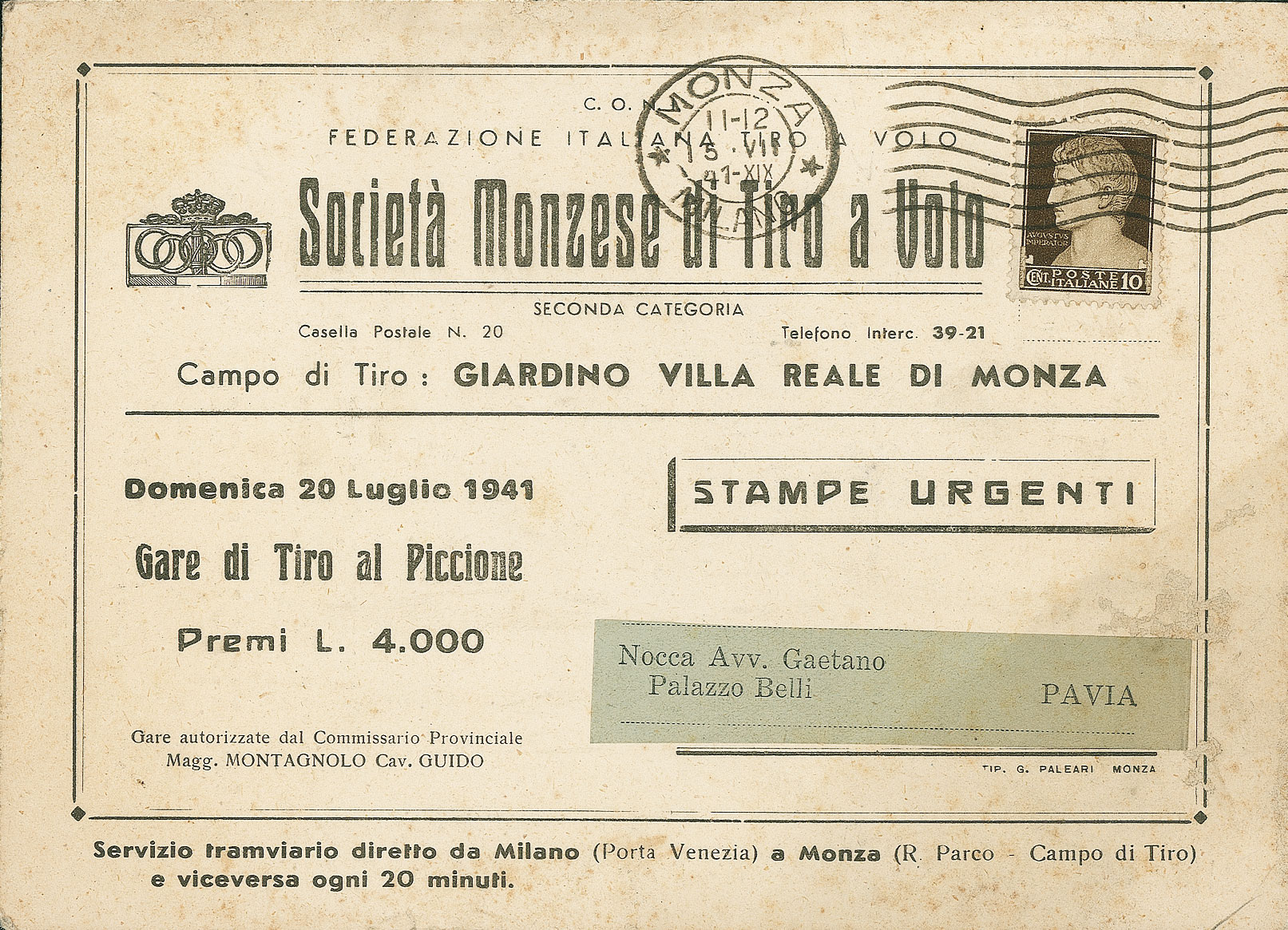 REGNO D'ITALIA - 10 cent - Società Monzese di Tiro a Volo/programma gare - cartoncino cartolina da Monza a Pavia del 15.7.41 (245)