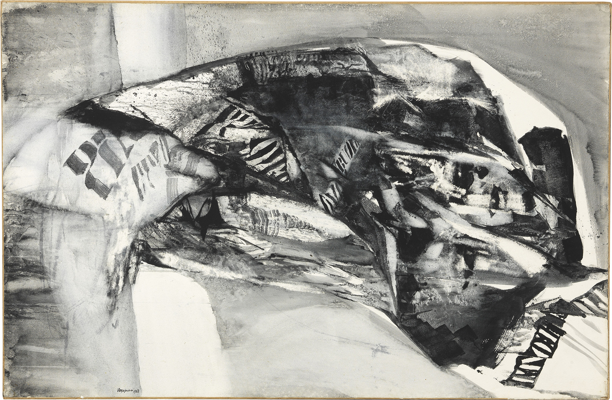 Firma e data in basso a sinistra: Vespignani 1963. Al verso sul telaio: etichetta parzialmente abrasa [Galleria Mutina, Modena] con dati dell'opera e n. 1116: timbro Galleria Mutina; sulla tela: timbro Galleria Mutina, Modena, con n. 1116.