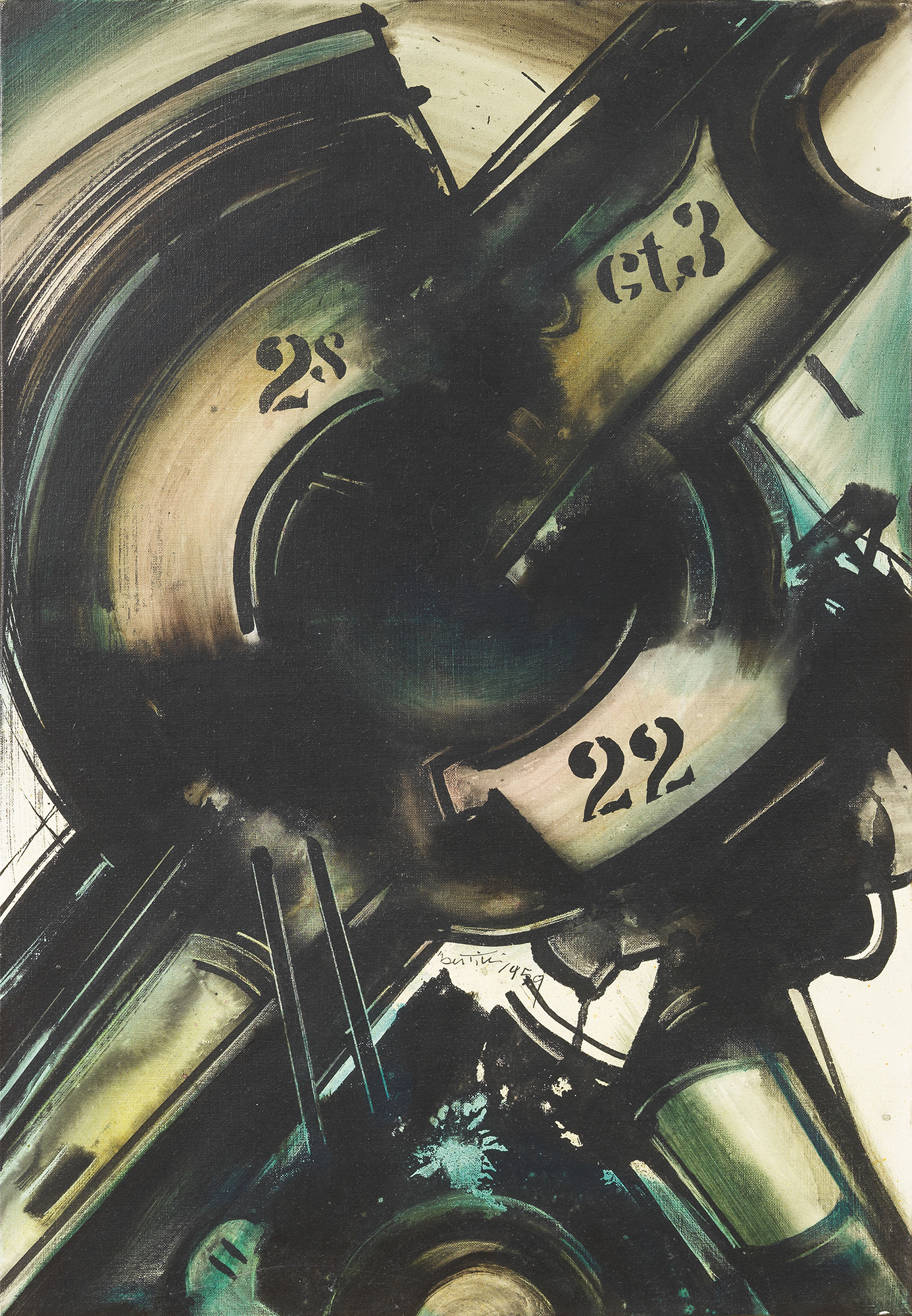 Firma, titolo, data e numeri al verso sulla tela: Gianni Bertini / Le cyclope égaré / 1959 / 10P / RG16L9:
