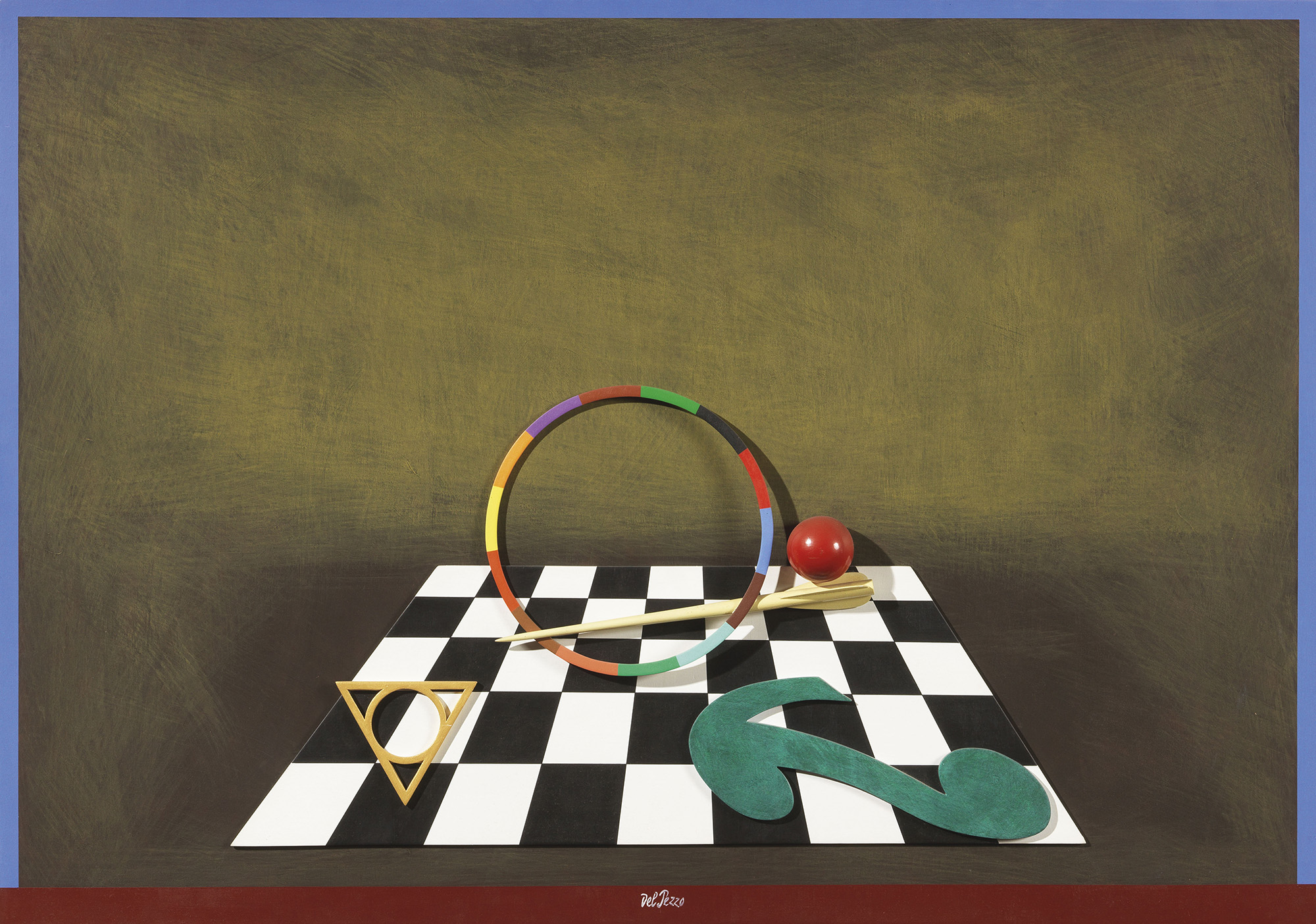 Firma in basso al centro: Del Pezzo; firma e titolo al verso: Lucio del Pezzo / "Alchemico II": etichetta Galleria Astuni / Fano / Lucio del Pezzo / "Armonie" / dic. 2000 - genn. 2001.