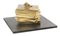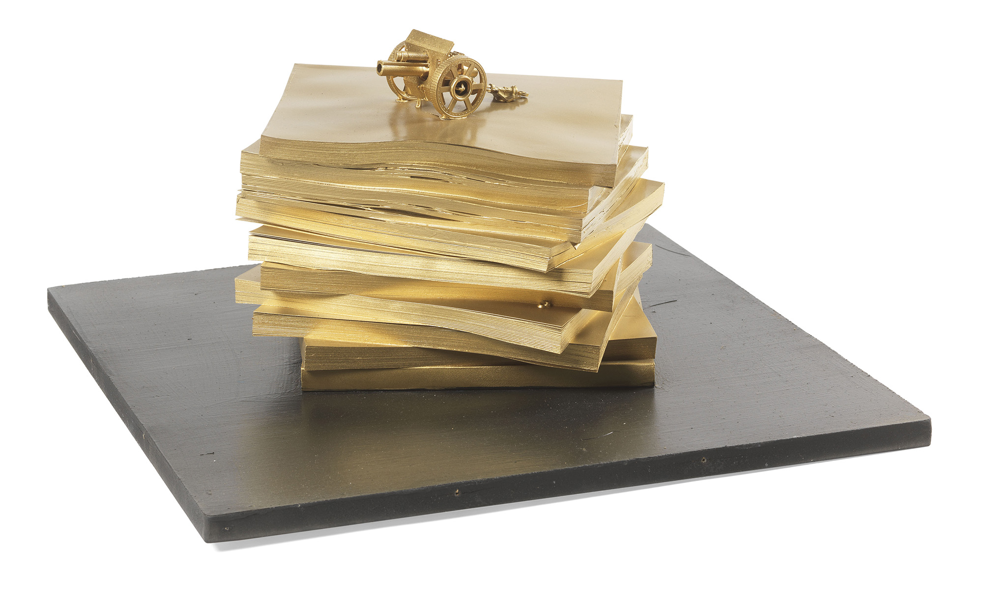 Assemblaggio di libri e giocattolo dipinti a spray su tavola, in teca di plexiglass