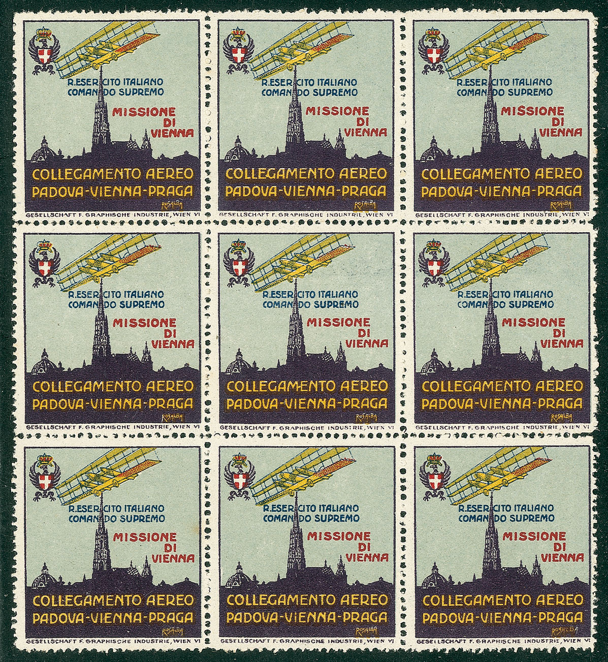REGNO D'ITALIA - Missione di Vienna - Vignetta del Collegamento Aereo Padova Vienna Praga - blocco di nove - gomma integra