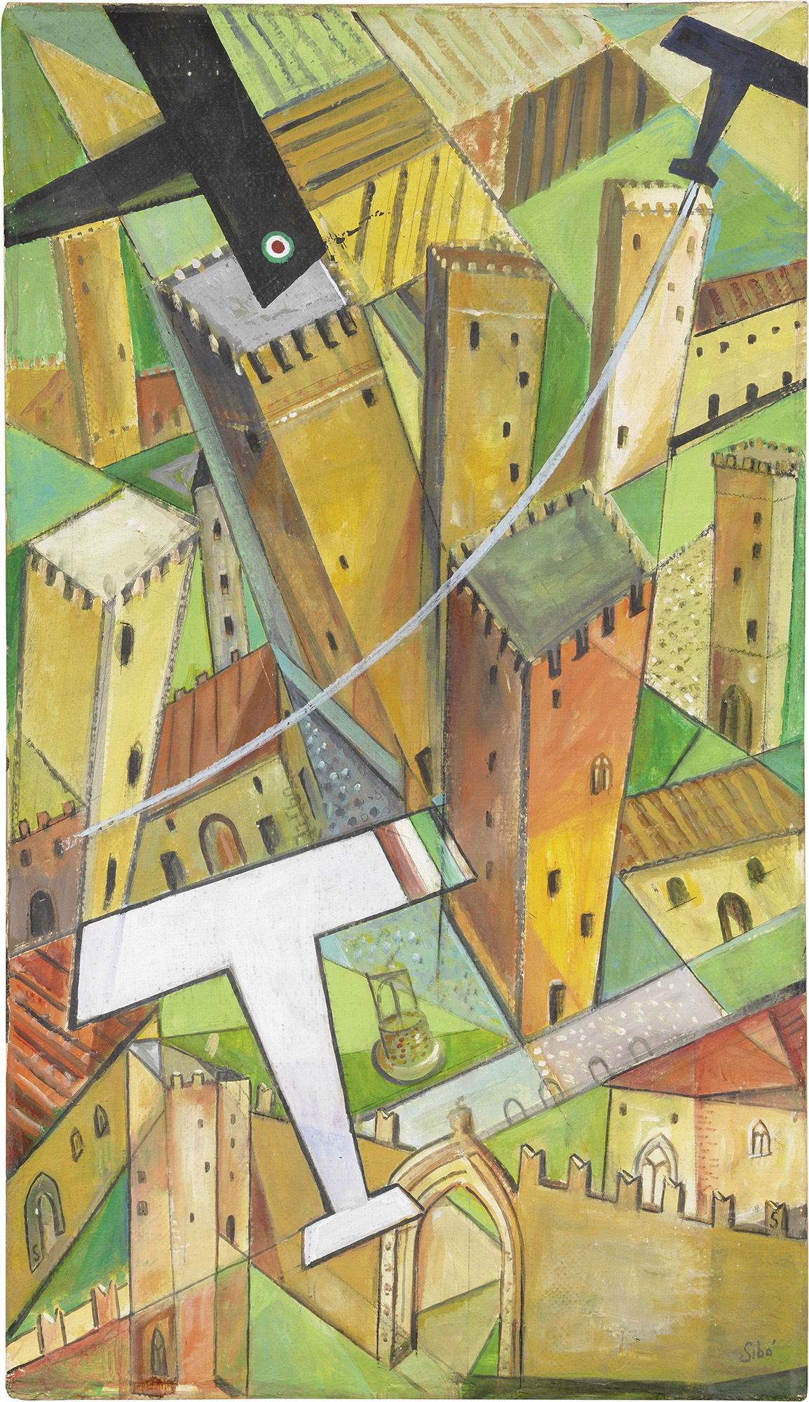Firma in basso a destra: Sibò; titolo e firma entro cartiglio al verso sulla tela: Sorvolando i ricordi: / San Gimignano / Sibò.