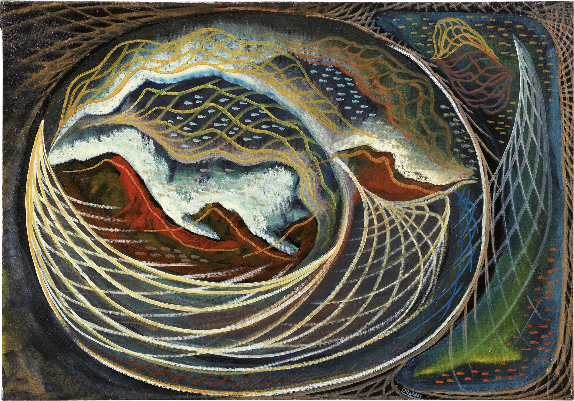 Firma in basso a destra: Oriani; titolo, data e dichiarazione di autenticità al verso sul telaio: Apparizione del paesaggio aereo, 33 / È mio / Pippo Oriani: