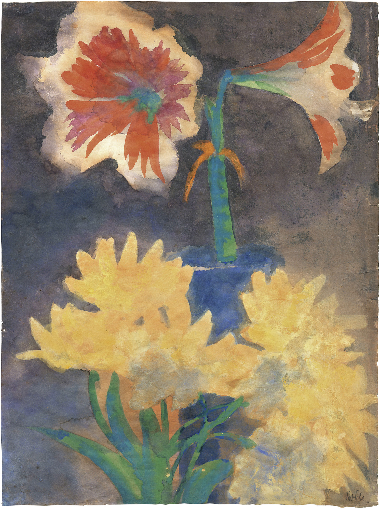 Emil Nolde, Rotweiße Amaryllis und gelbe Blüten, 1930 ca.
