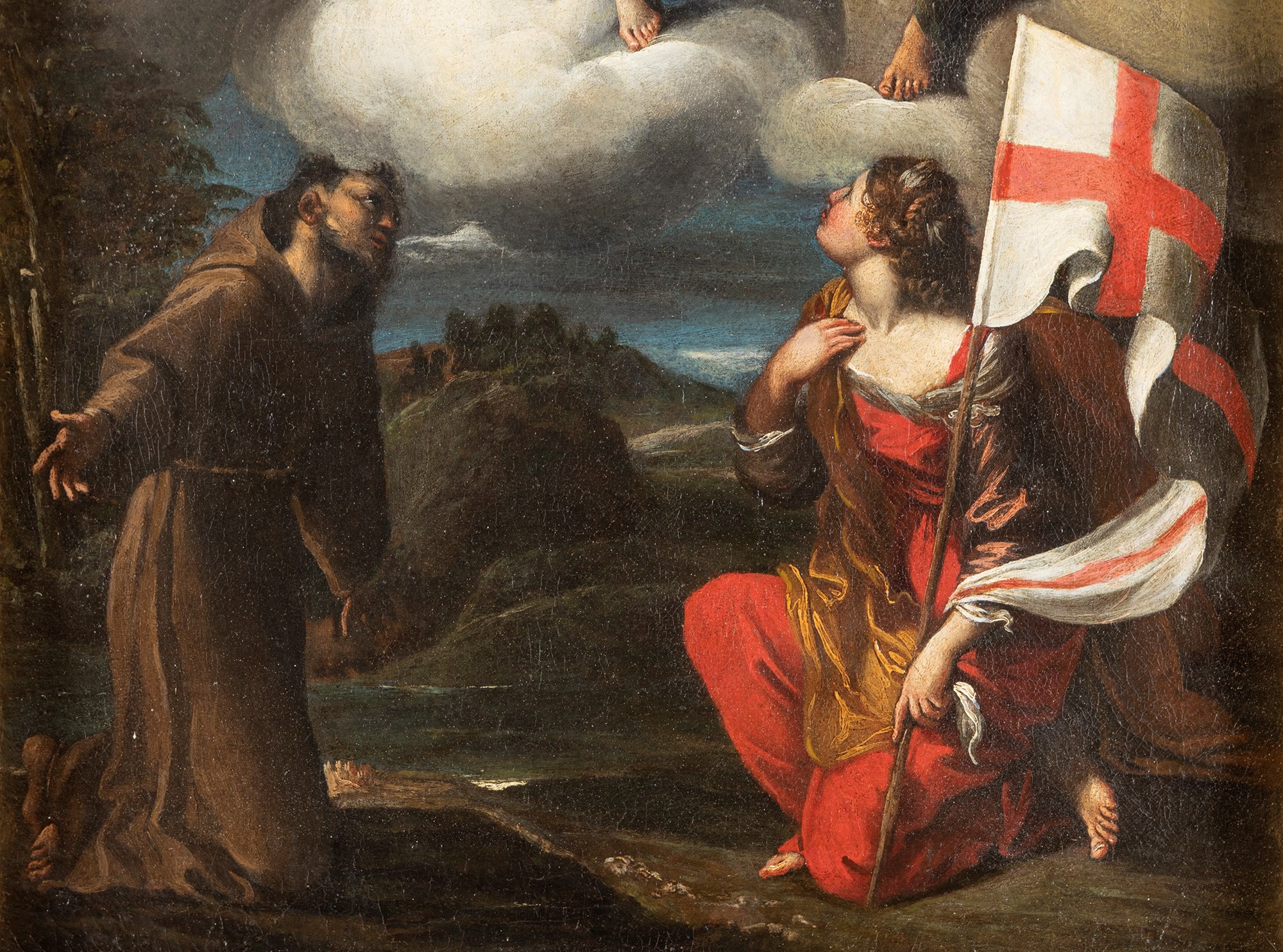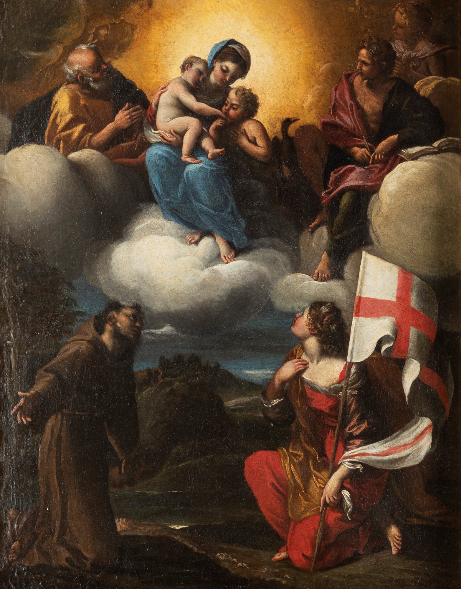 Scuola emiliana, secolo XVII - Madonna con Bambino in gloria, San Giovannino, San Giovanni Evangelista, San Pietro, angeli, San Francesco e Sant'Orsola