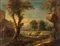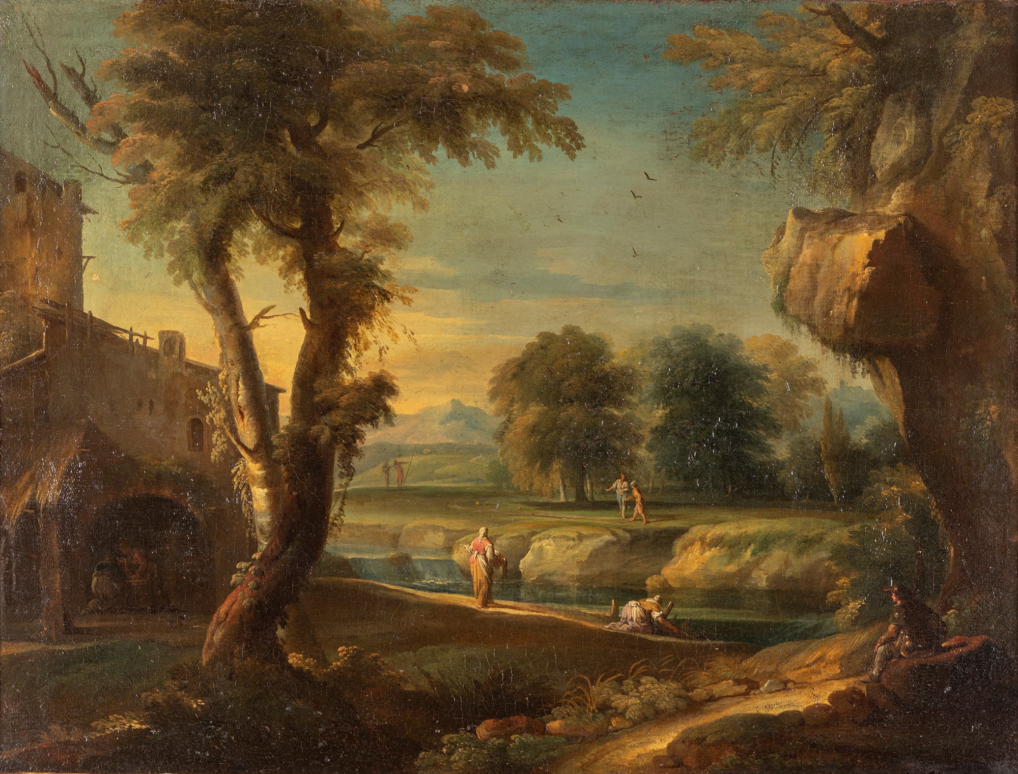 Scuola veneta, secolo XVIII - Paesaggio con lavandaie e viandanti presso un fiume e casolare