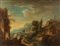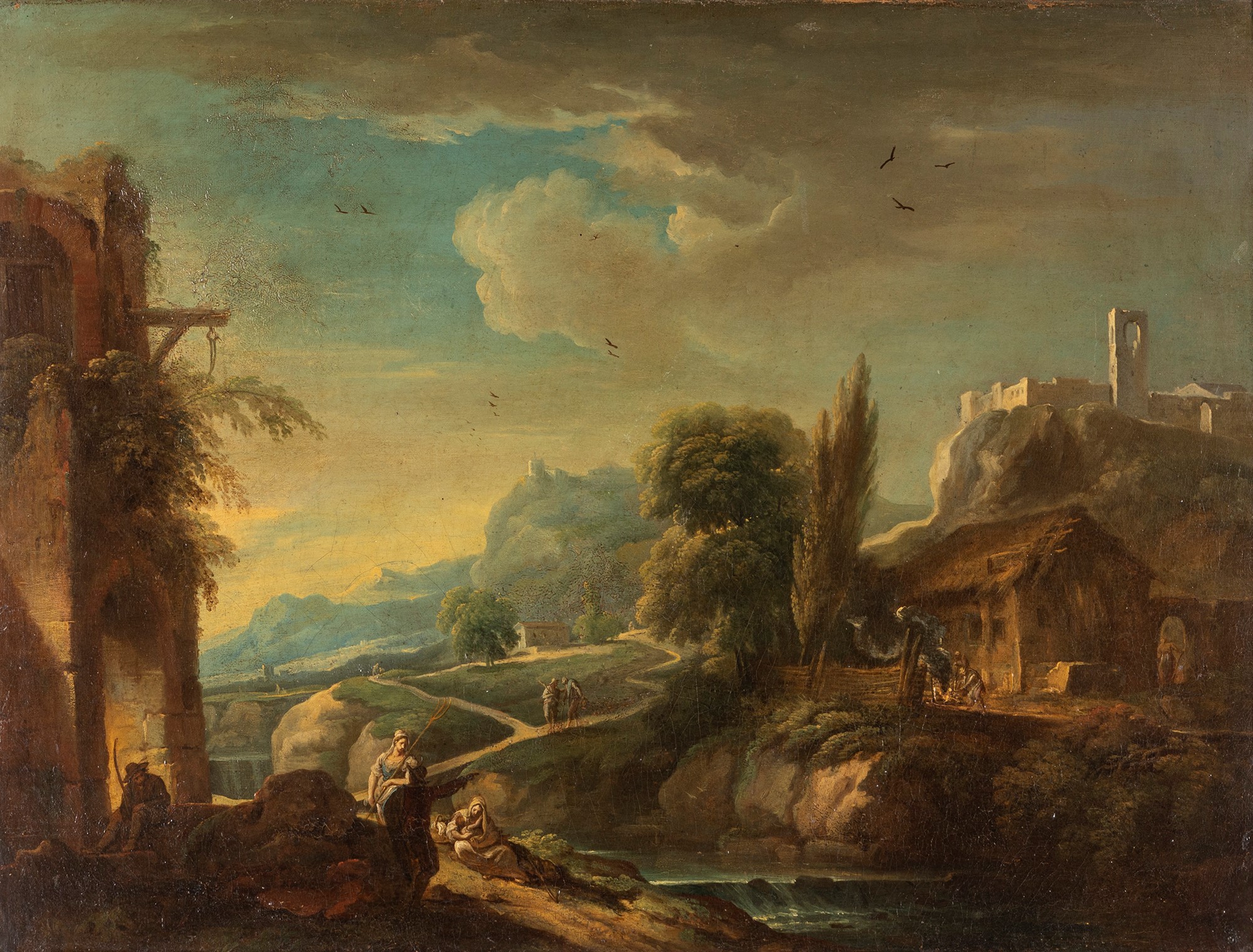 Scuola veneta, secolo XVIII - Paesaggio con viandanti presso un fiume, rovine, casolare e castello sullo sfondo