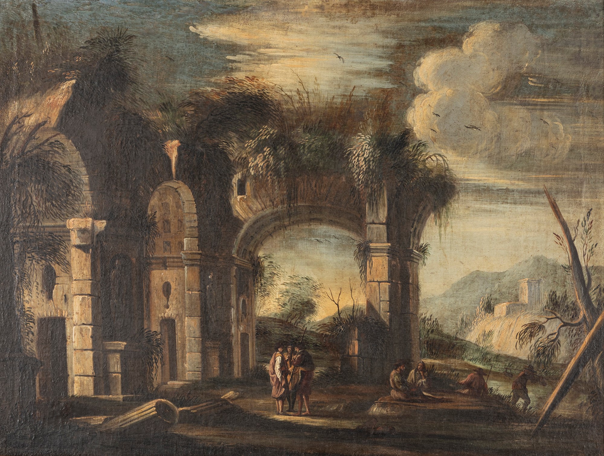 Scuola dell'Italia settentrionale, secolo XVIII - Capriccio architettonico con viandanti e corso d'acqua