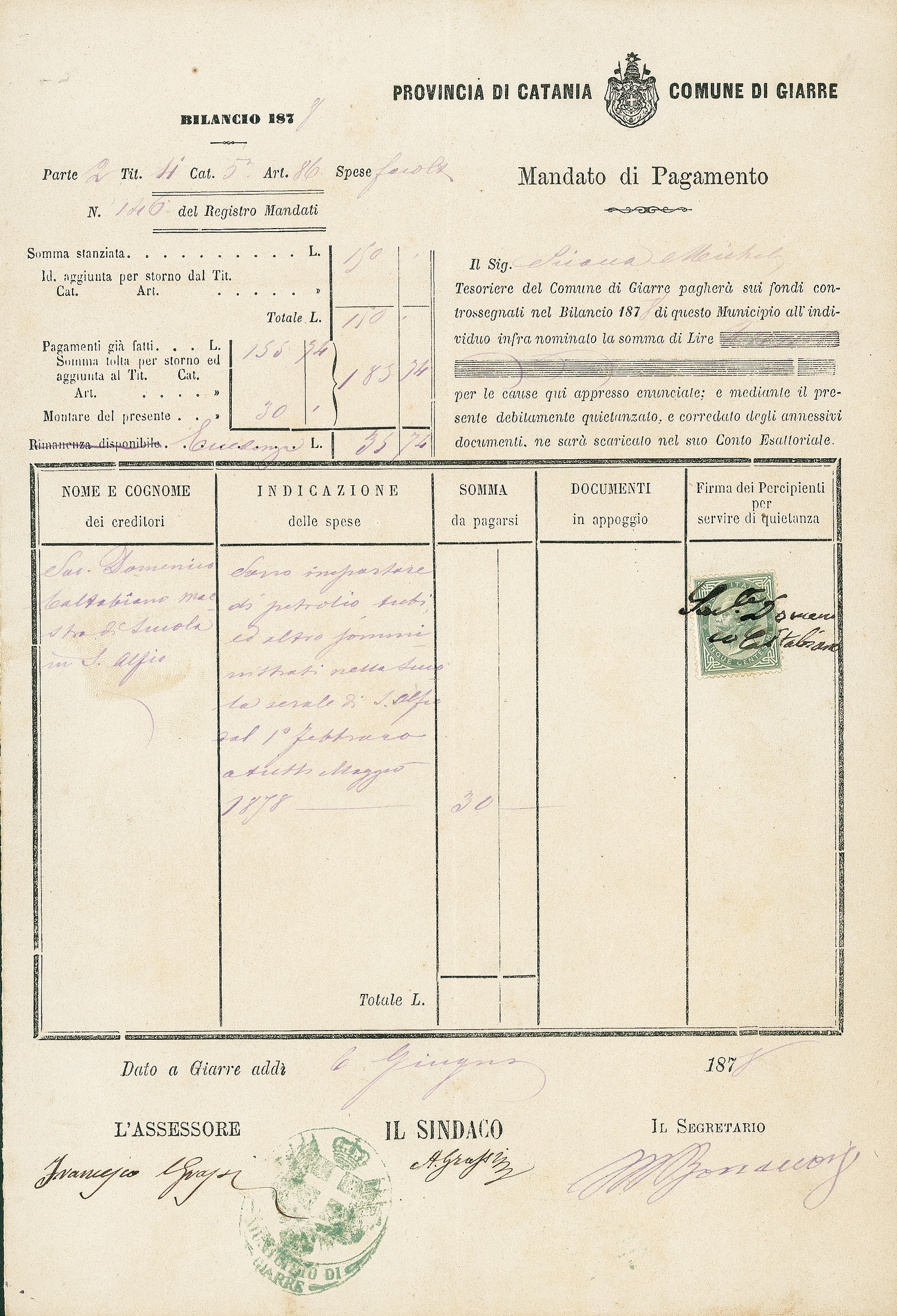 REGNO D'ITALIA - 5 cent - uso fiscale su intero Mandato di Pagamento - Giarre 1878 (16)