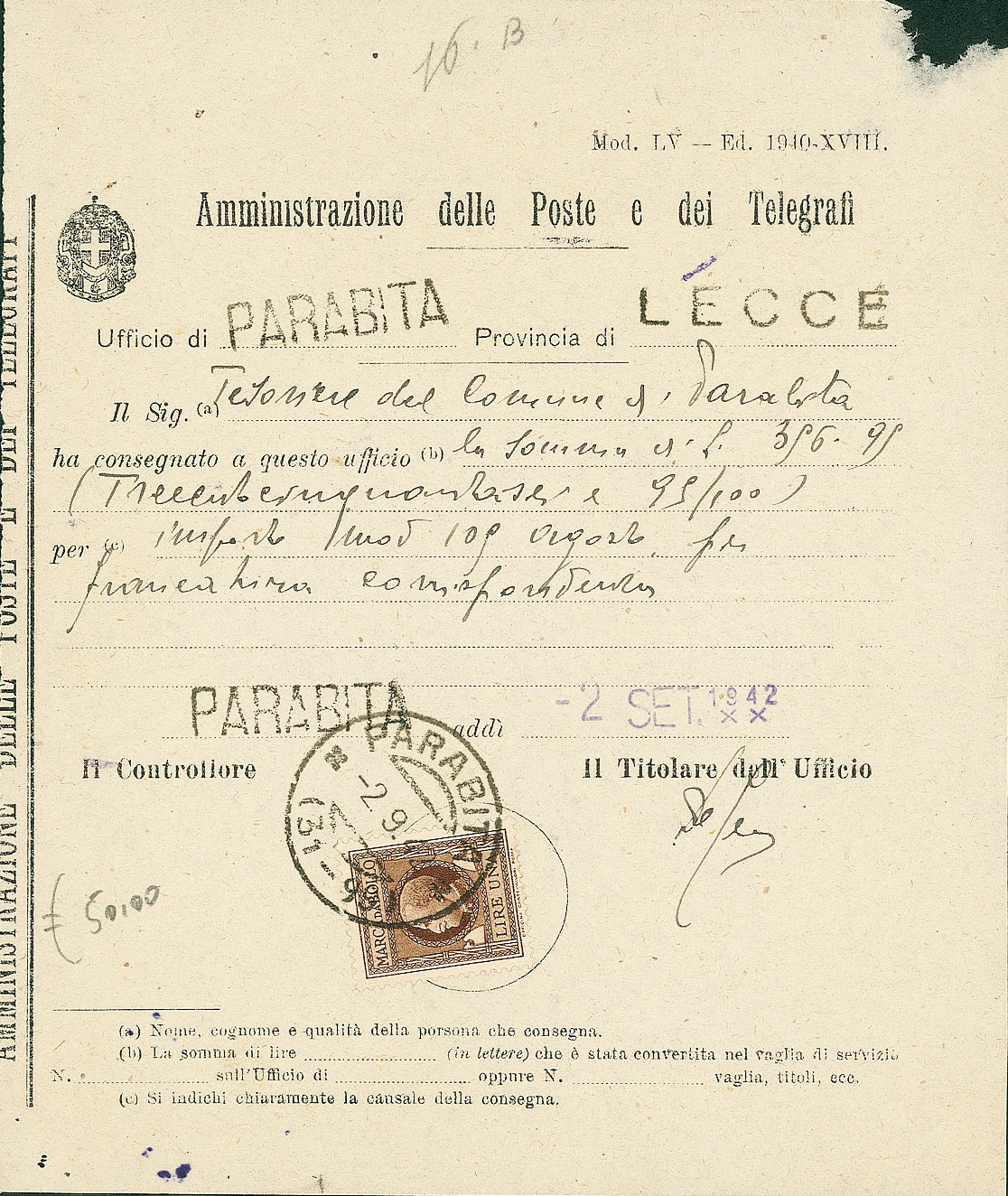 Lotto 427 | REGNO D'ITALIA - Marca da Bollo da 1 lira su modulo da Parabita del 2.9.42 (19)