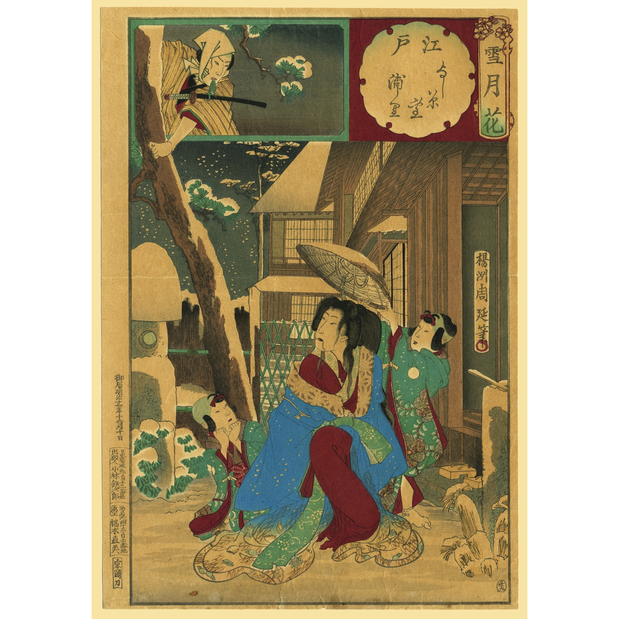 YOSHU CHIKANOBU (1838 - 1912), Neve a Yoshiwara, 1884. Xilografia a colori firmata ''Yoshu Chikanobu hitsu'' con sigillo toshidama. Serie: Neve, luna e fiori. Formato: oban (mm. 325x215). Editore: Kobayashi Tetsujiro. Edizione: Periodo Meiji (1884)
