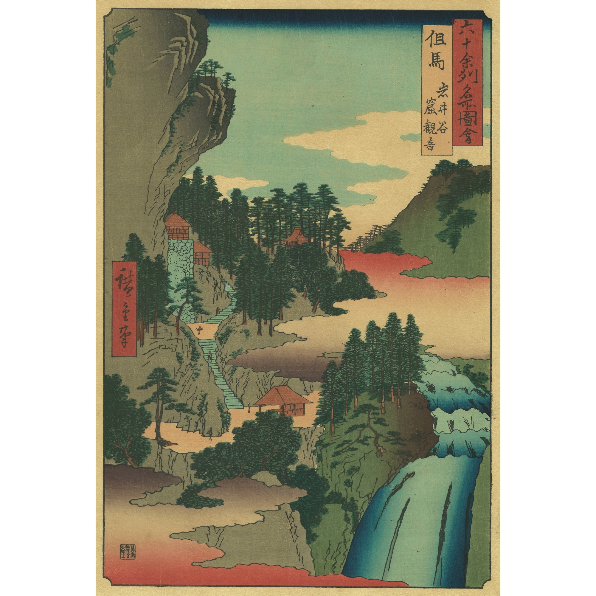HIROSHIGE ANDO (Edo 1797 - 1858), Il Tempio di Kannon nella valle di Iwai, 1853. Xilografia a colori firmata ''Hiroshige hitsu''. Serie: 60 diverse Provincie del Giappone. Formato: oban (mm. 340x230). Edizione: Periodo Showa (1940 c.a)