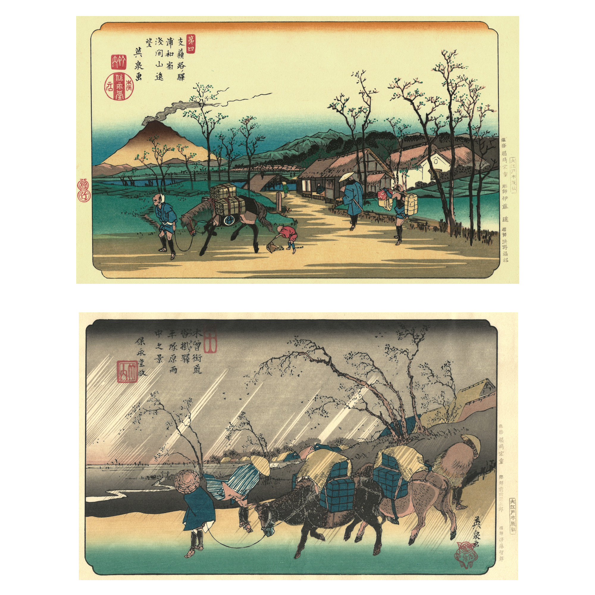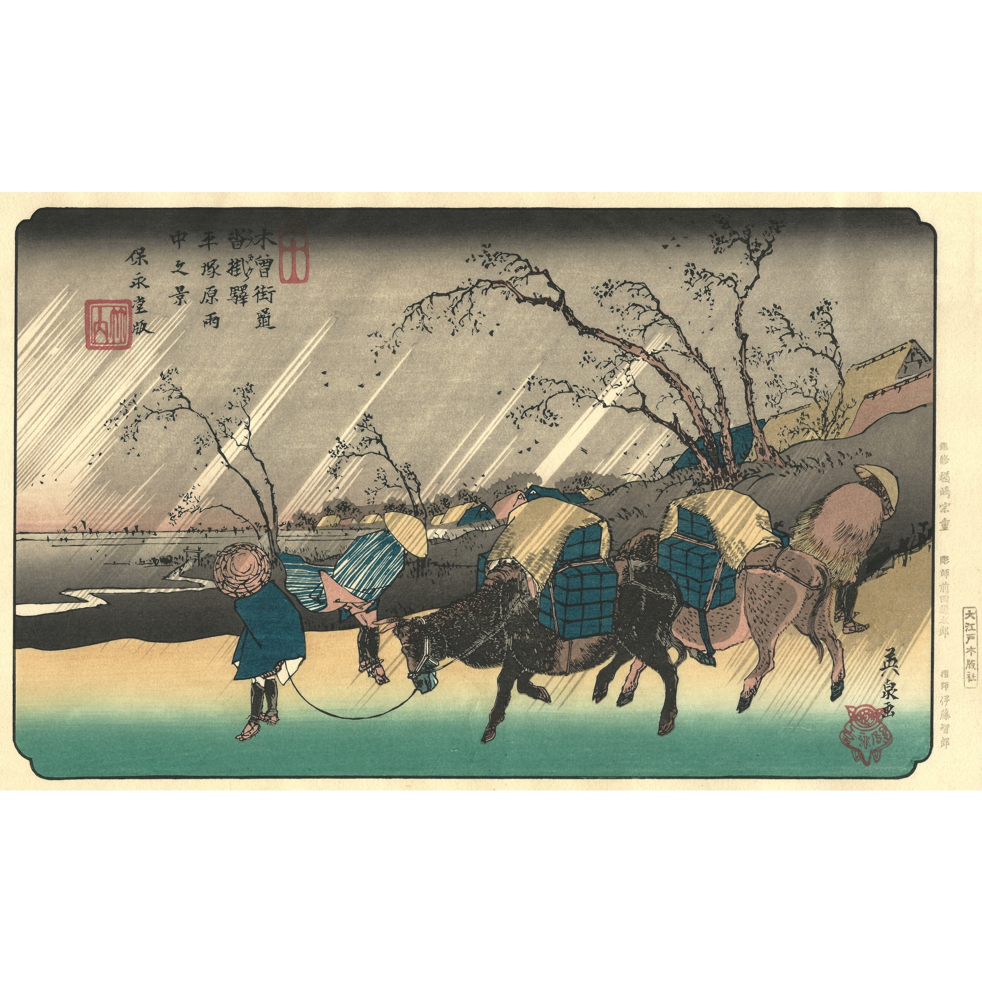 KEISAI EISEN (1790 - 1848), Temporale sulla piana di Hiratsuka, 1835-37. Xilografia a colori. Serie: Le 69 stazioni della Kisokaido. Formato: oban (mm. 215x348). Editore: Ooedo Mokuhansha. Edizione: Periodo Showa (1970-80)