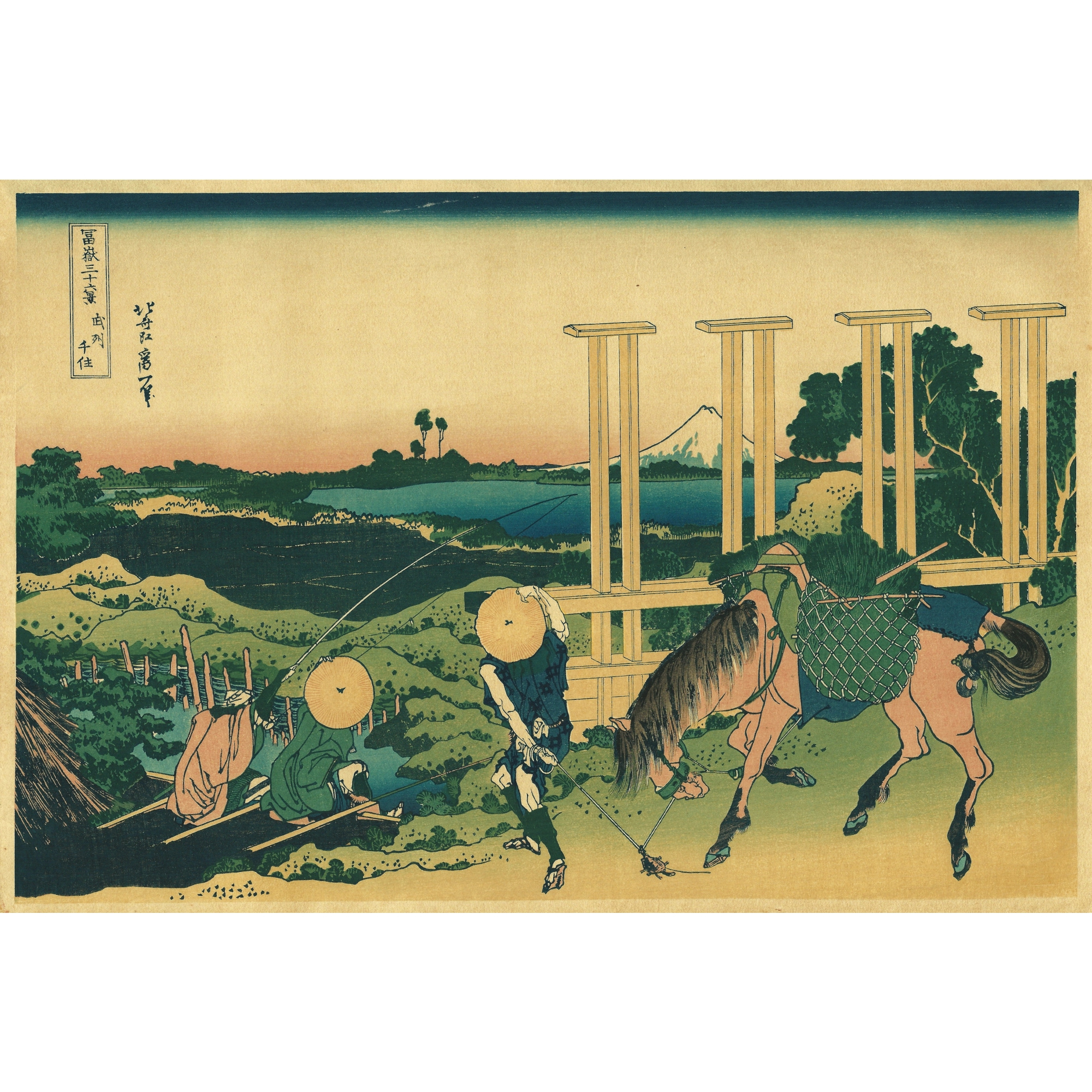 HOKUSAI (Edo 1760 - 1849), Senju nella provincia di Musashi a Edo, 1830-32. Xilografia a colori, firmata ''Hokusai aratame Iitsu hitsu''. Serie: Trentasei vedute del Fuji. Formato: oban (mm. 247x368). Editore: Takamizawa Mokuhansha (al verso). Edizione: Periodo Taisho-Showa (1925-30).
