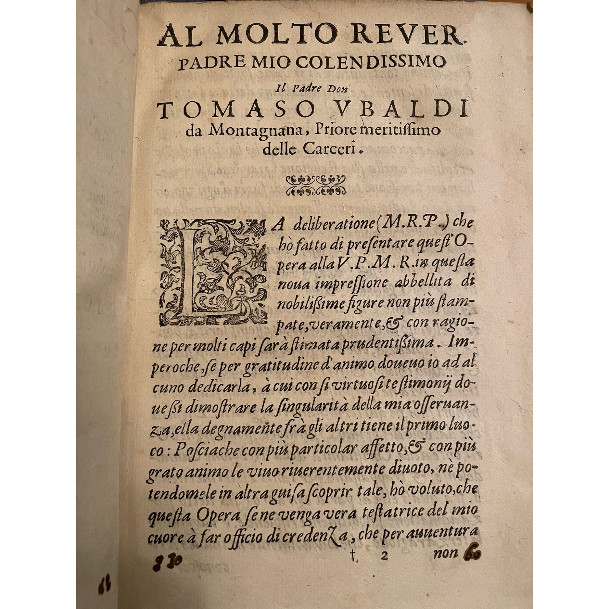 1619, Contarini L., Il vago, & diletteuole giardino oue si leggono gli infelici fini di molti huomini illustri.., Stampato in Venezia per Alessandro De Vecchi. Descrizione: 2 v. legati in uno ([64], 467, [1] p.; [16], 351 [i.e. 234], [2] p.), 4º(22 cm), pergamena coeva, titolo manoscritto a china d'epoca al dorso. Mancante delle carte di sguardia.