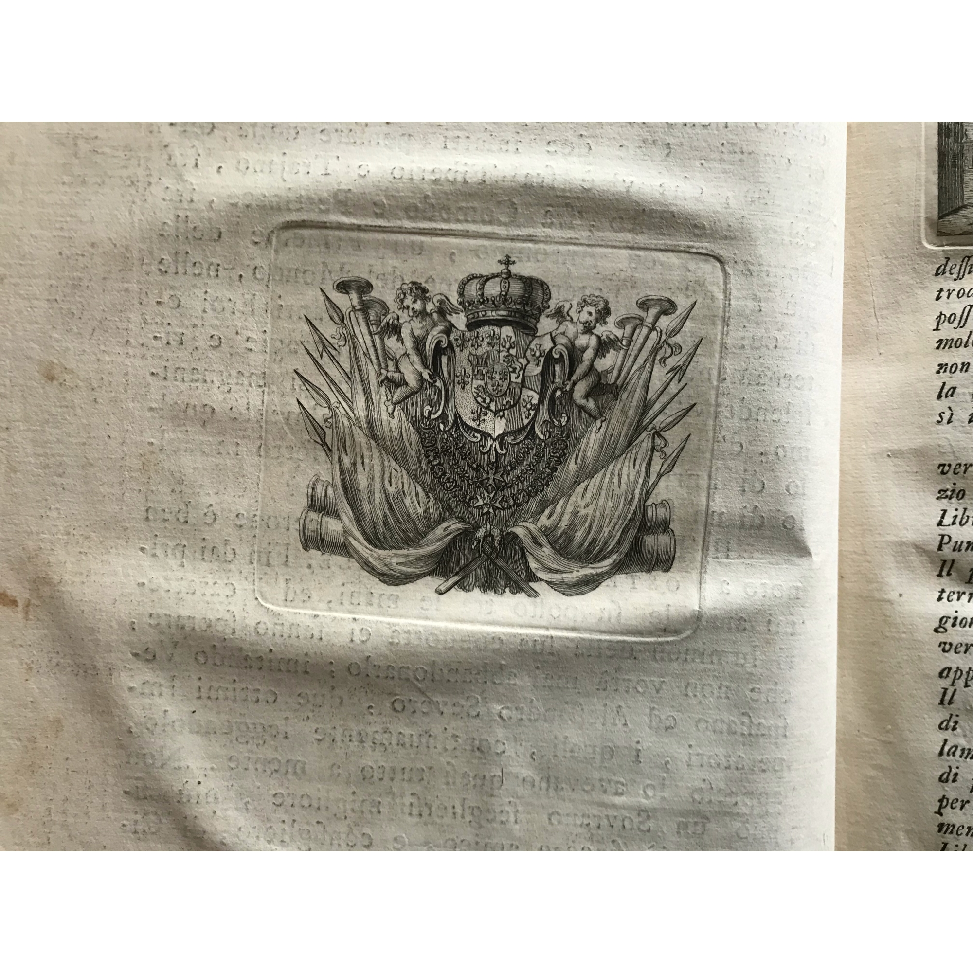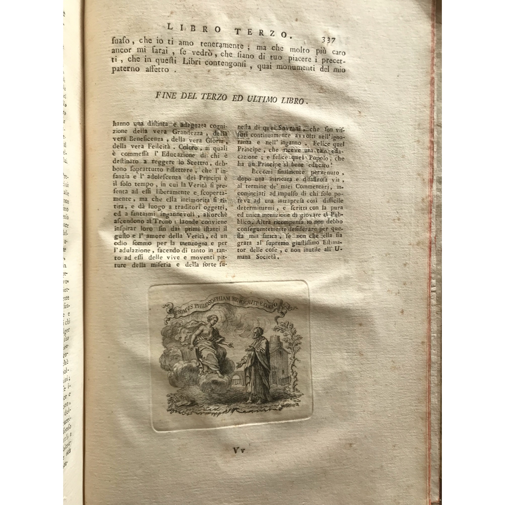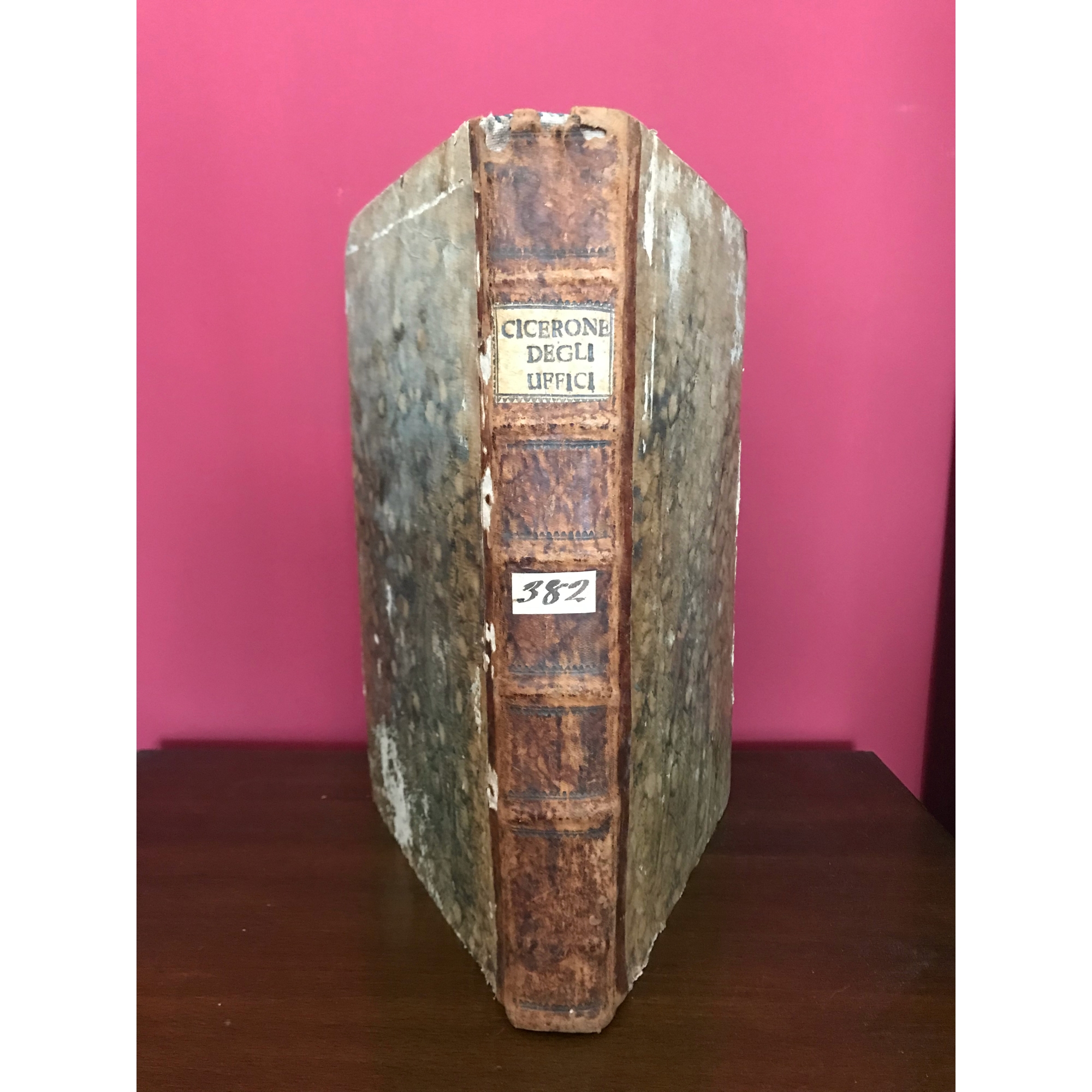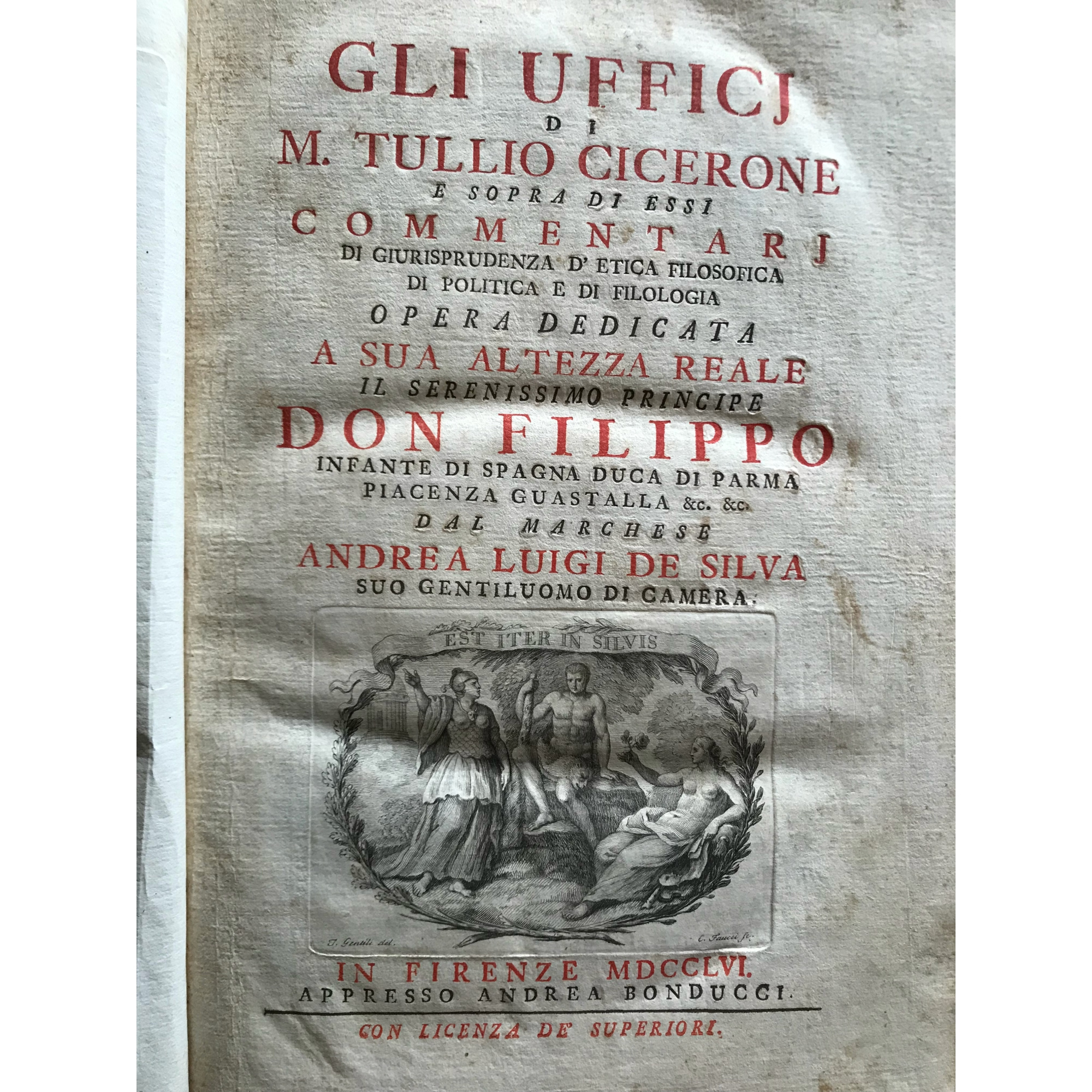 1756, Cicerone, Degli Uffici ''..tradotti sull'edizione latina del Grevio divisi in nuovi capitoli, Libri Tre e sopra di essi Commentari di Giurisprudenza d'Etica filosofica di Politica e di Filologia''. Stampato in Firenze, appresso Andrea Bonducci. Desrizione: X, [2], 348 [i.e.352] p., [2] c. di tav. calcogr. 1 antiporta, folio (33 cm), mezza pelle coeva con dorso a cinque nervi, tassello coi titoli ed etichettina in carta con numerino ms. a china d'epoca. Alla sguardia a china in bella grafia d'epoca annotazione di dono. Frontespizio stampato in rosso e nero. Antiporta calcogr. disegnata da Tommaso Gentili e incisa da CArlo Gregori. Vignetta calcogr. diseganta da Gentili e incisa da CArlo Faucci, sul frontespizio Stemma calcografico. Iniziali calcogr. Vignetta calcogr. Edizione di gran pregio del gli Uffici ciceroniani impreziosita da copiosi e intereanti commentari filosofico-giuridici. Cfr. Gamba 2196