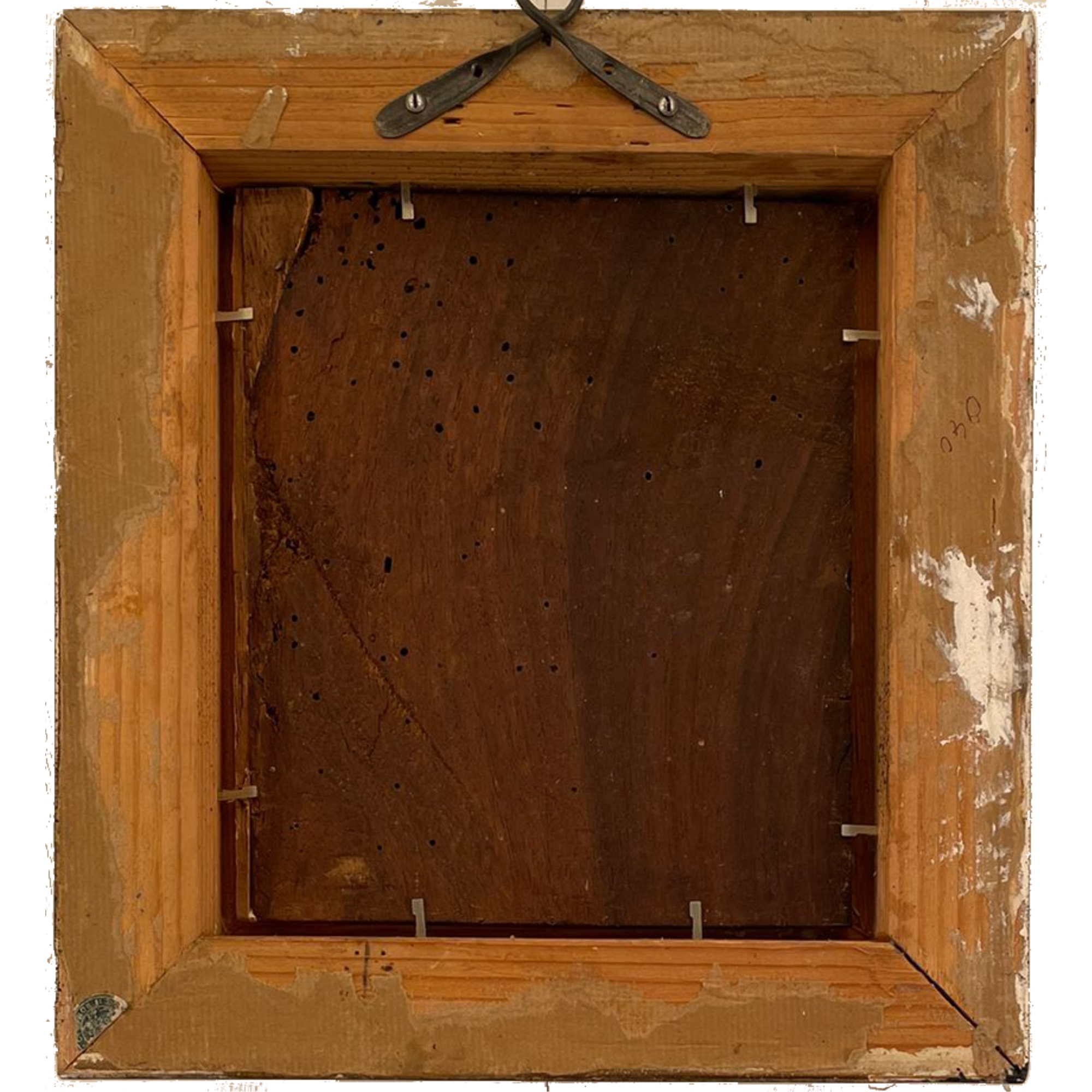 “Sacra Famiglia con Madonna che allatta”. Olio su tavola, area veneta, metà del XVIII secolo. Cm 20 x 17,5. Cornice del XIX secolo. Restauri.