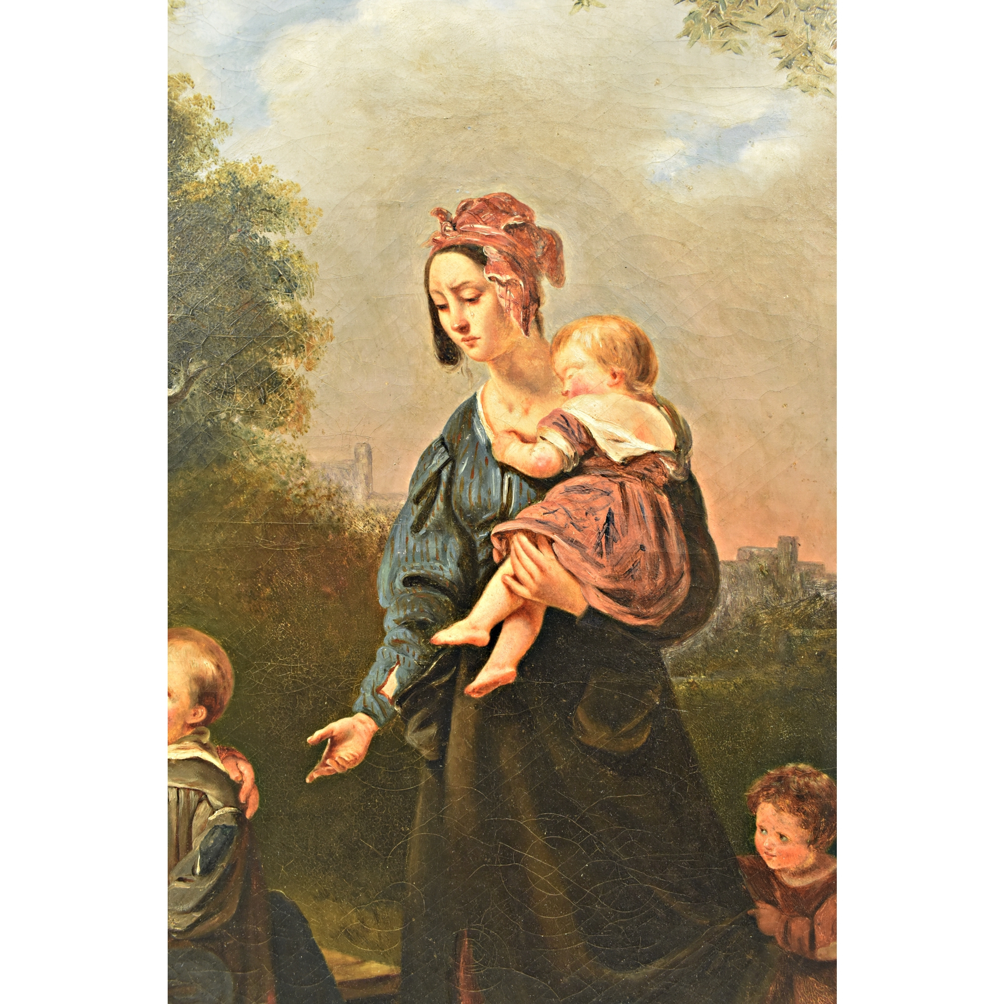 “La carità del vecchio reduce alla giovane vedova”, dipinto francese ad olio su tela della metà del XIX secolo. Cm 73 x 60 oltre alla cornice dorata coeva.