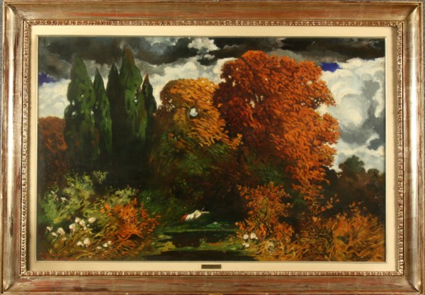 TRAUGOTT RUDISUHLI HERMANN - Nato a Lenzburg (Svizzera) nel 1864. Morto nel 1944. Allievo del padre Jakob Lorenz Rüdisühli, incisore e pittore, conosciuto per i suoi paesaggi, dipinse insieme al fratello Paul Eduard più di 4500 opere nel corso degli anni, molte delle quali vittime della II Guerra Mondiale. Alcune sue opere si trovano nei musei di Magonza, Zurigo ed Elberfeld. Dipinto olio su tela raff. ''PARCO''. Firmato e datato 1912 in basso a sinistra. In cornice. Mis. Lung. cm. 100 Alt. cm. 65 ca.