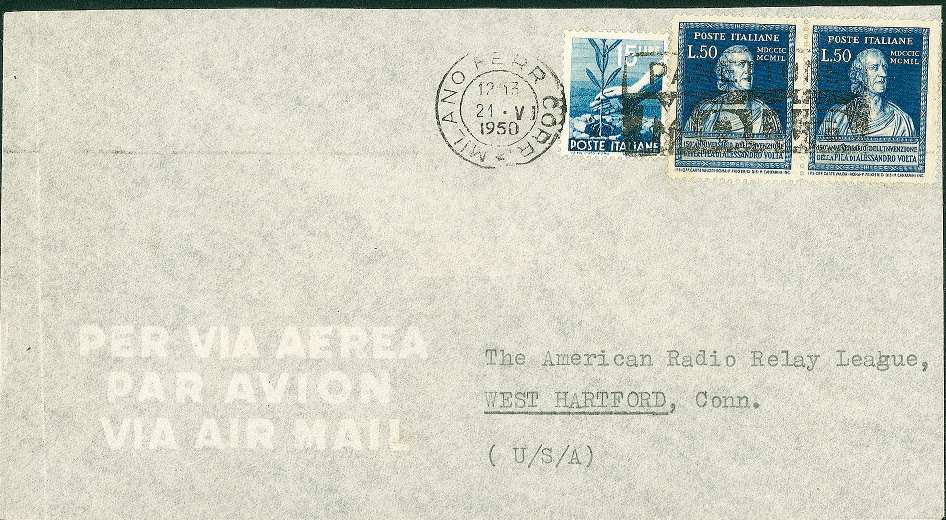 REPUBBLICA - Coppia del 50 lire Volta + 15 lire Democratica - aerogramma da Milano per gli USA del 21.5.50 (612+560 - 750+)
