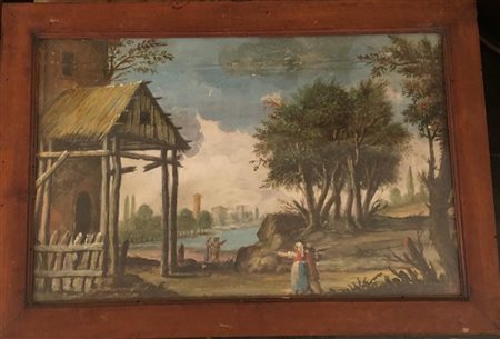 Ignoto del XIX secolo - Paesaggio con fiume e figure - Olio su tela cm.26x40 con cornice coeva