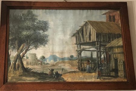 Ignoto del XIX secolo - Paesaggio con cascina e figure - Olio su tela cm.26x40 con cornice coeva