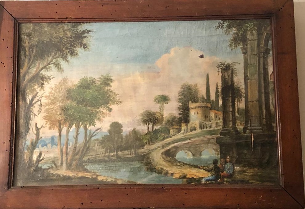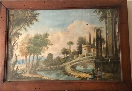 Ignoto del XIX secolo - Paesaggio con rovine e figure - Olio su tela cm.26x40 con cornice coeva - lievi difetti