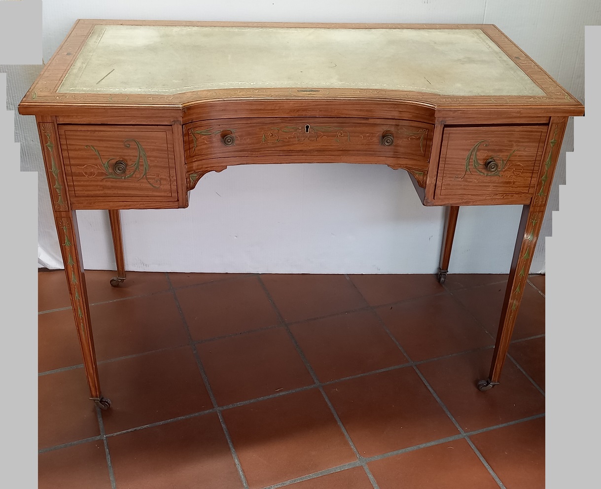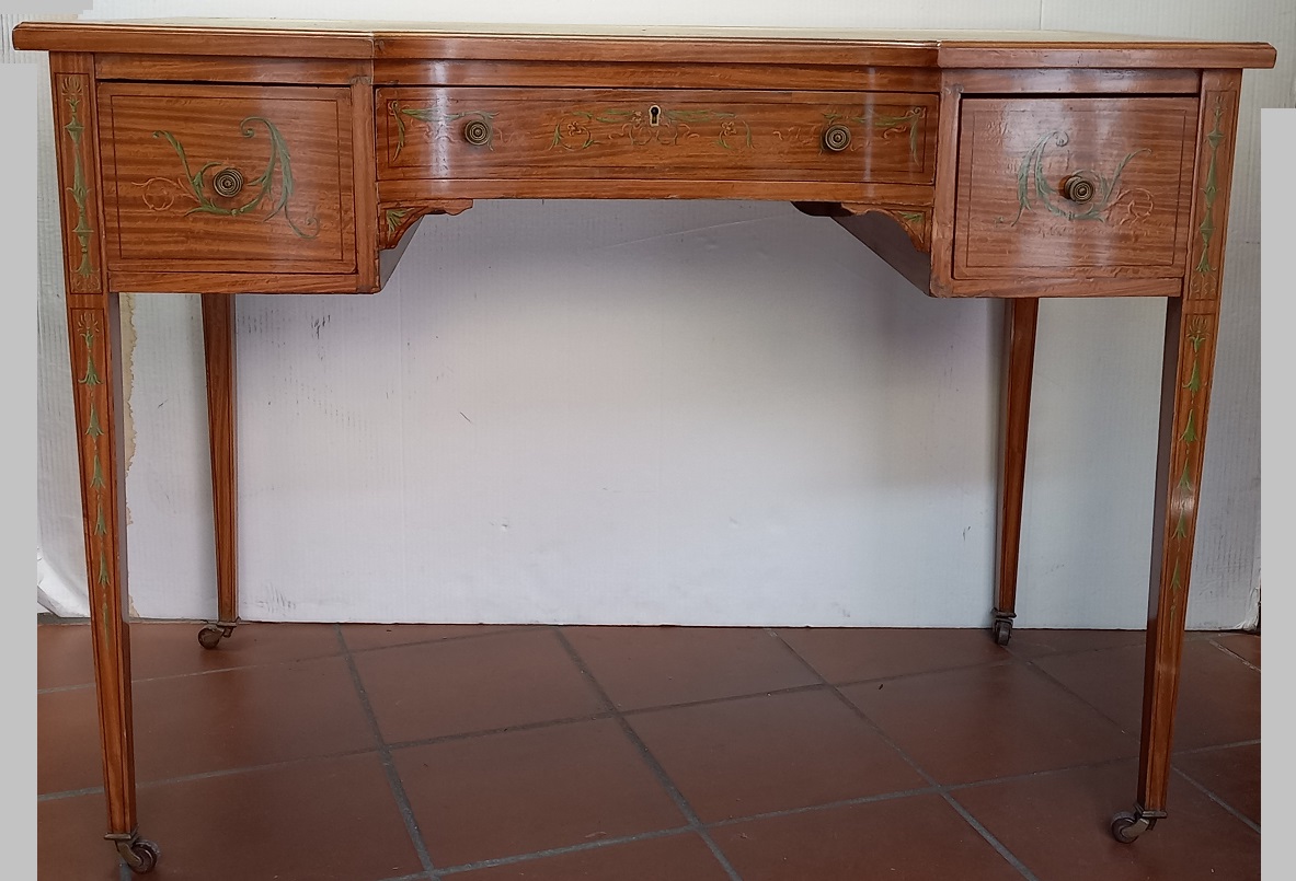 Scrittoio da centro lastronato e decorato in vernis martin a volute di foglie e fiori, piano con pelle impressa in oro, Inghilterra XIX secolo cm.100x55x72