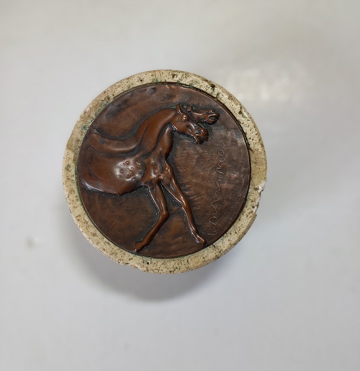 BRUNO CASSINARI (1912-1992) - Cavalli - Fermacarte in bronzo e travertino diametro cm.7 h.cm.3 - firmata