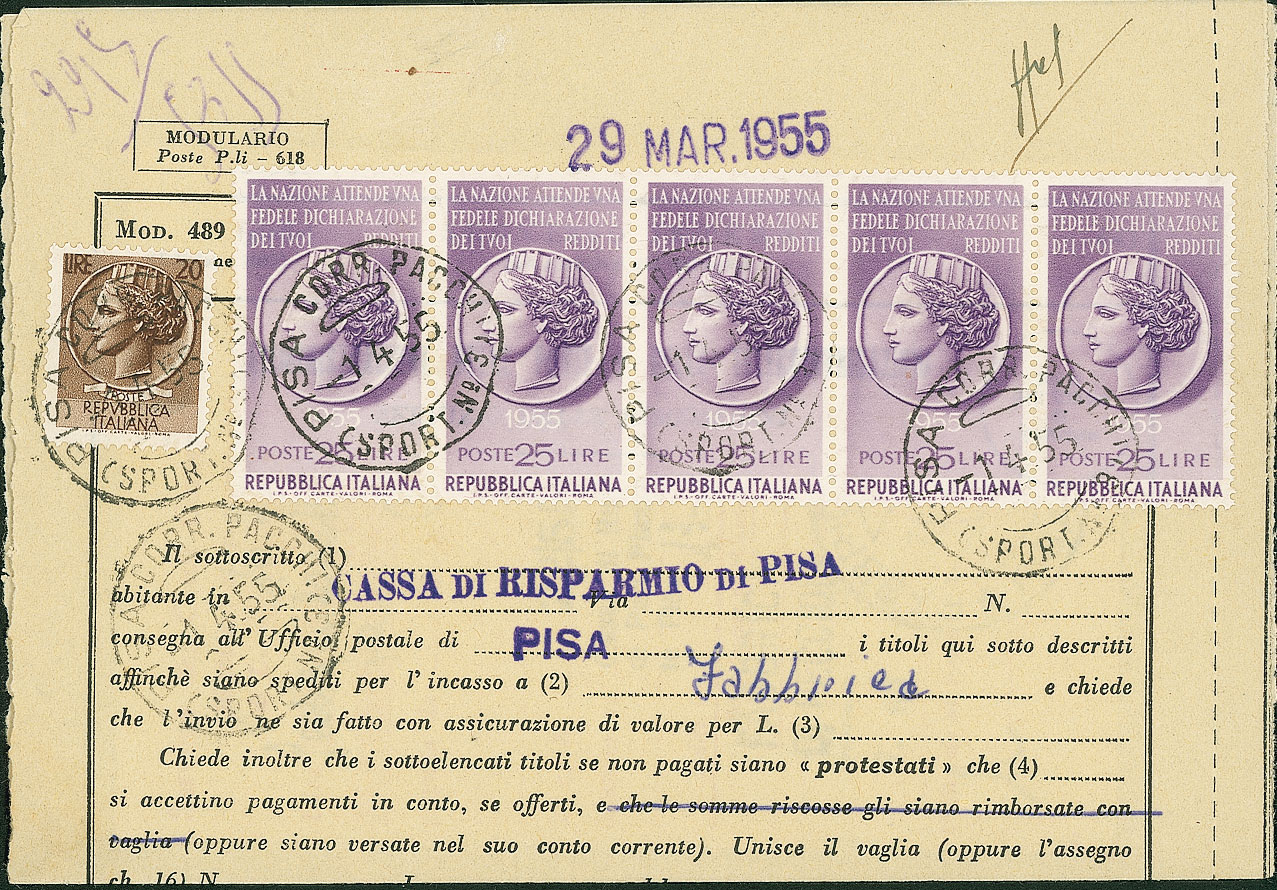 REPUBBLICA - Cinque pezzi del 25 lire Reddito + 20 lire Siracusana - intero modulo di servizio - Pisa 1.4.55 (778+768)