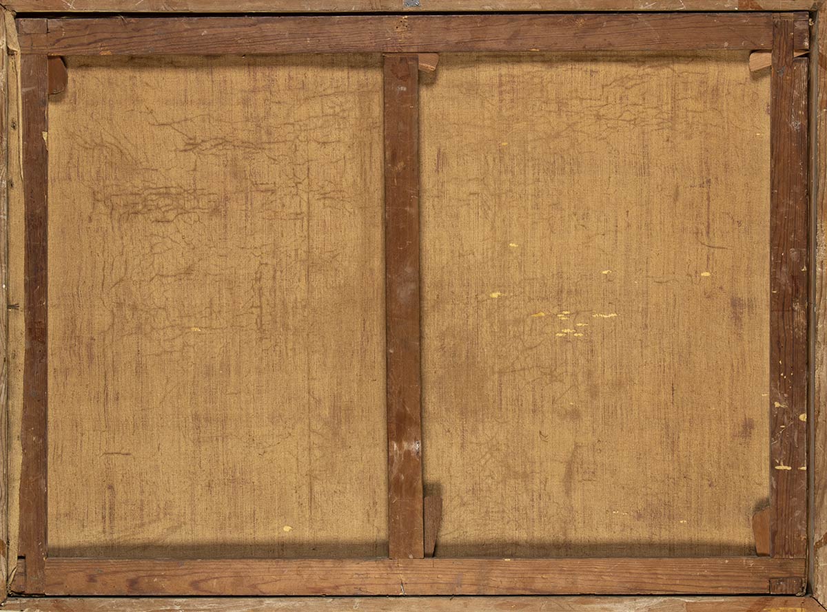 Buone condizioni. Segni del battente sui lati e detensionamento della tela. Cornice senza vetro.