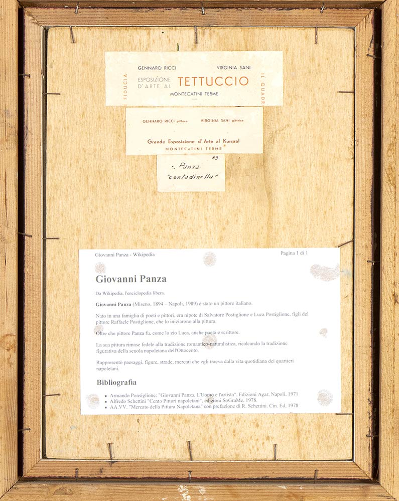 Firmato in basso a destra: G. Panza, al retro etichetta dell' Esposizione d’arte al Tettuccio Montecatini Terme,altra etichetta della Grande Esposizione d’arte al Kursaal Montecatini Terme