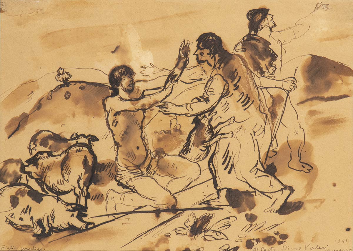 Firma, dedica e anno in basso a destra: "Al poeta Diego Valeri", 1941, Carena. Titolo in basso a sinistra: Figliol prodigo