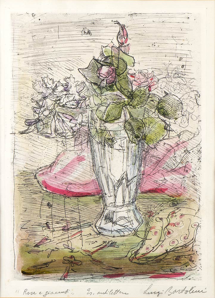 Firmato in basso a destra: Luigi Bartolini, titolato in basso a sinistra: Rose e giacinti. Al retro etichetta della galleria "La Bottega"