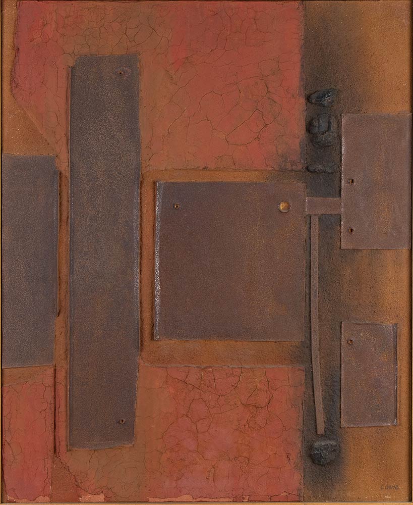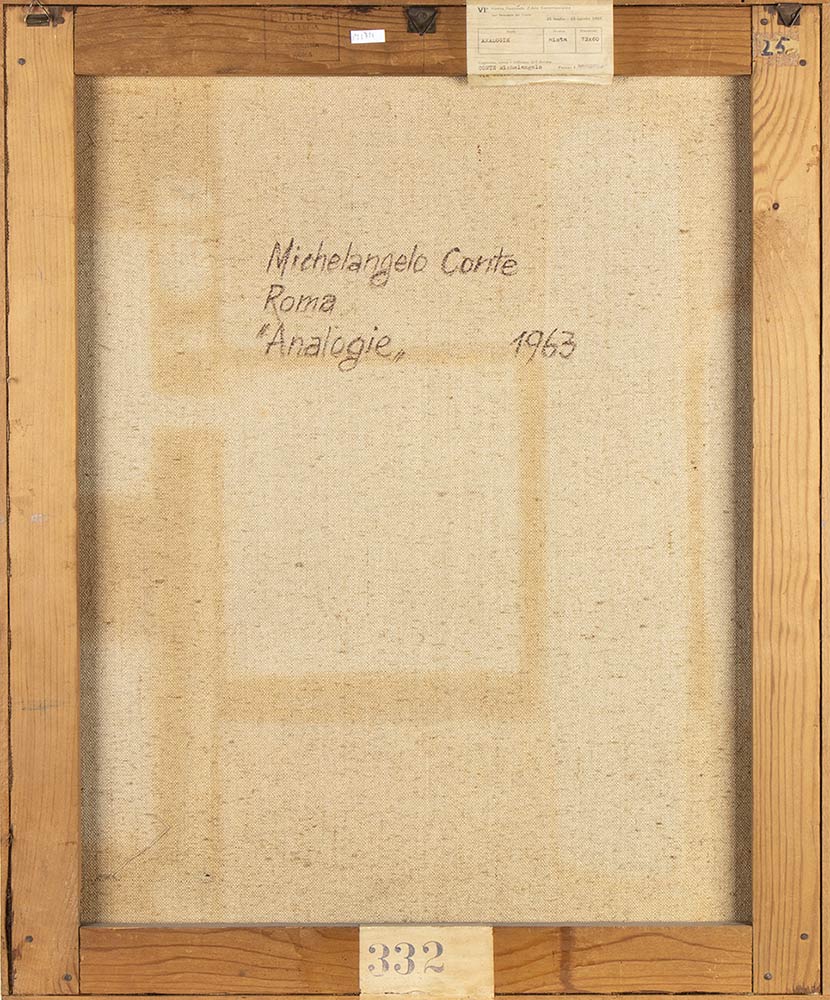 Firmato in basso a destra: Conte. Al retro: timbro della Galleria Piattelli di Roma; etichetta della VI Mostra Nazionale d'Arte Contemporanea di San Benedetto del Tronto; firma, luogo, data, titolo: Michelangelo Conte, Roma, Analogie, 1963