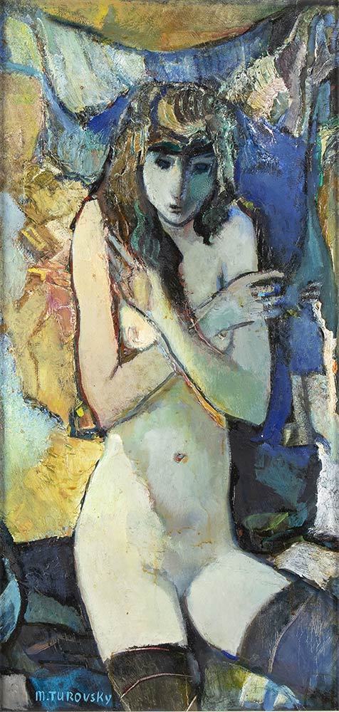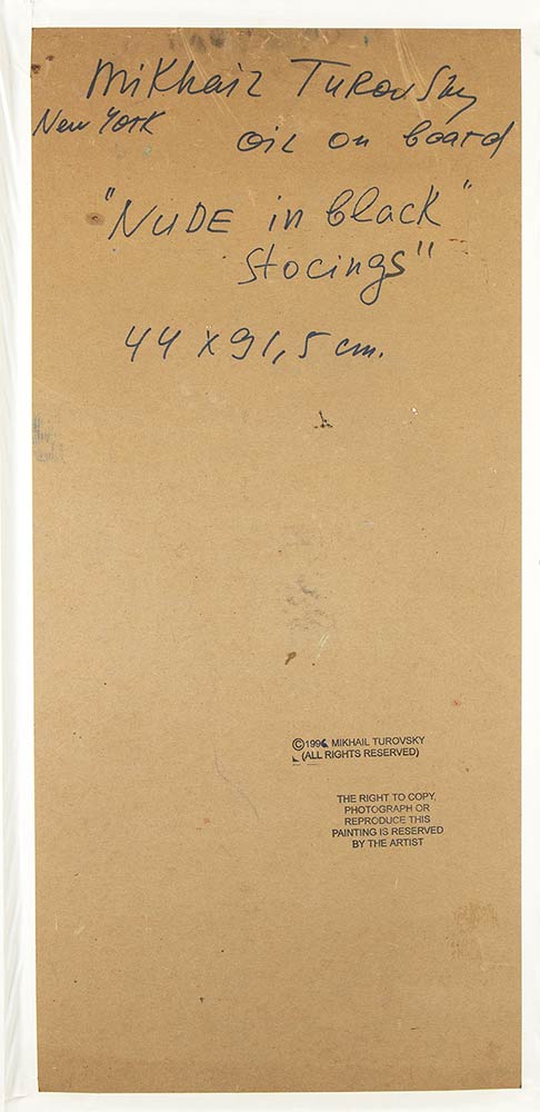 Firmato in basso a sinistra: M. Turovsky. Firma, luogo, tecnica e titolo al retro: Mikhail Turovsky, New York, Oil on board, Nude in black stockings. Timbro dello studio dell'artista, 1996.