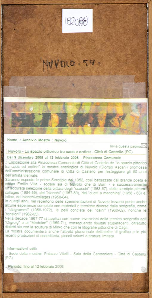 Firmato e datato al retro: Nuvolo, 1959